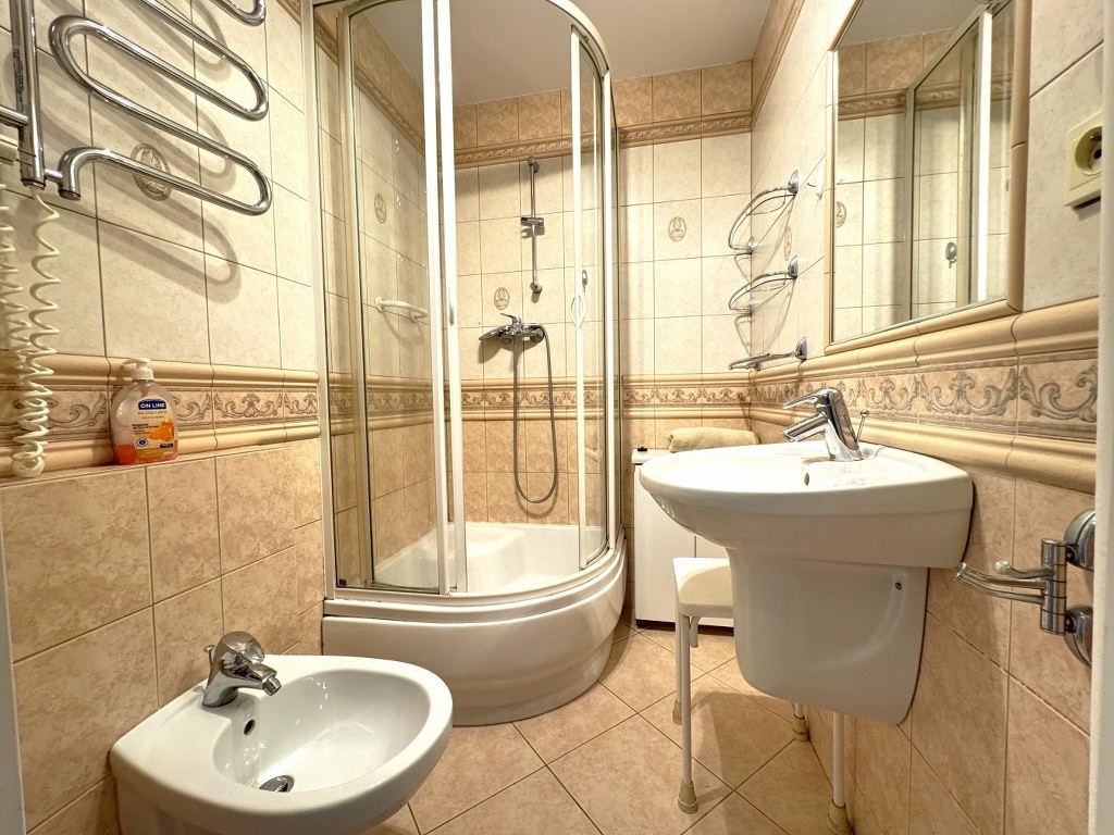 • łazienka z prysznicem, umywalką i bidetem,
