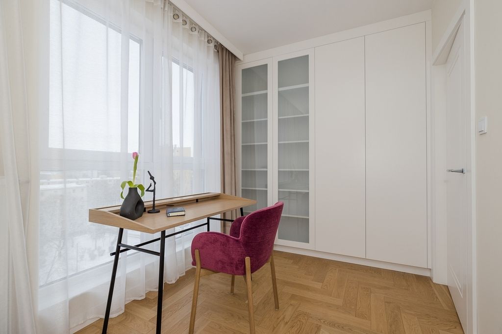 To wnętrze, które „wykończono dla siebie”, czyli bez żadnych kompromisów. Klasę materiałów widać i czuć w każdym detalu. O wysokim standardzie apartamentu świadczą m.in. klasyczny, ponadczasowy dębowy parkiet, zabudowa meblowa skrojona na miarę, kuchnia wyposażona w sprzęt marki Siemens (w tym ekspres do kawy w zabudowie oraz piekarnik z funkcją grilla i mikrofali), blaty oraz wyspa kuchenna wykonane z trwałego i eleganckiego spieku.