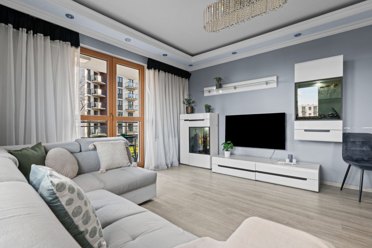 Jasne i funkcjonalne 3-pokojowe mieszkanie z balkonem, położone na 1. piętrze nowoczesnego budynku z 2018 roku przy ul. Rudnickiego, na zielonych Bielanach.