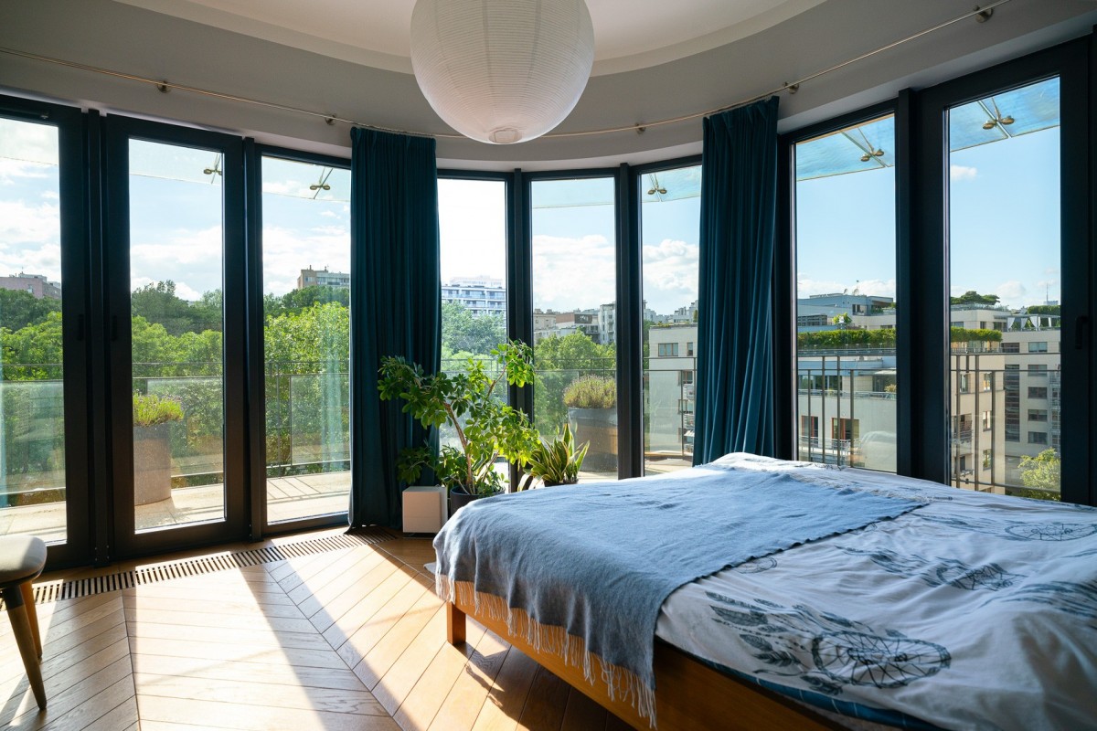 Za ukrytymi drzwiami znajduje się prywatna część master z sypialnią, garderobą, dużą łazienką z wanną i prysznicem oraz drugim tarasem (19 m²). Oddzielenie tej części zapewnia pełną intymność.
