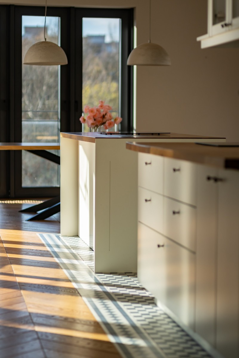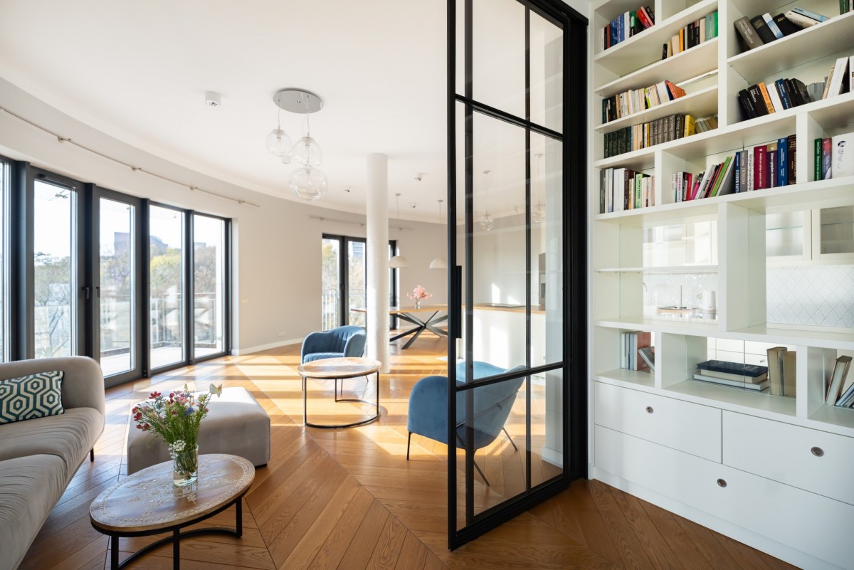 Strefa dzienna to przestronny, jasny salon z przeszklonym gabinetem, nowoczesną kuchnią i wyjściem na taras o powierzchni ponad 23 m² z widokiem na zieloną Warszawę.