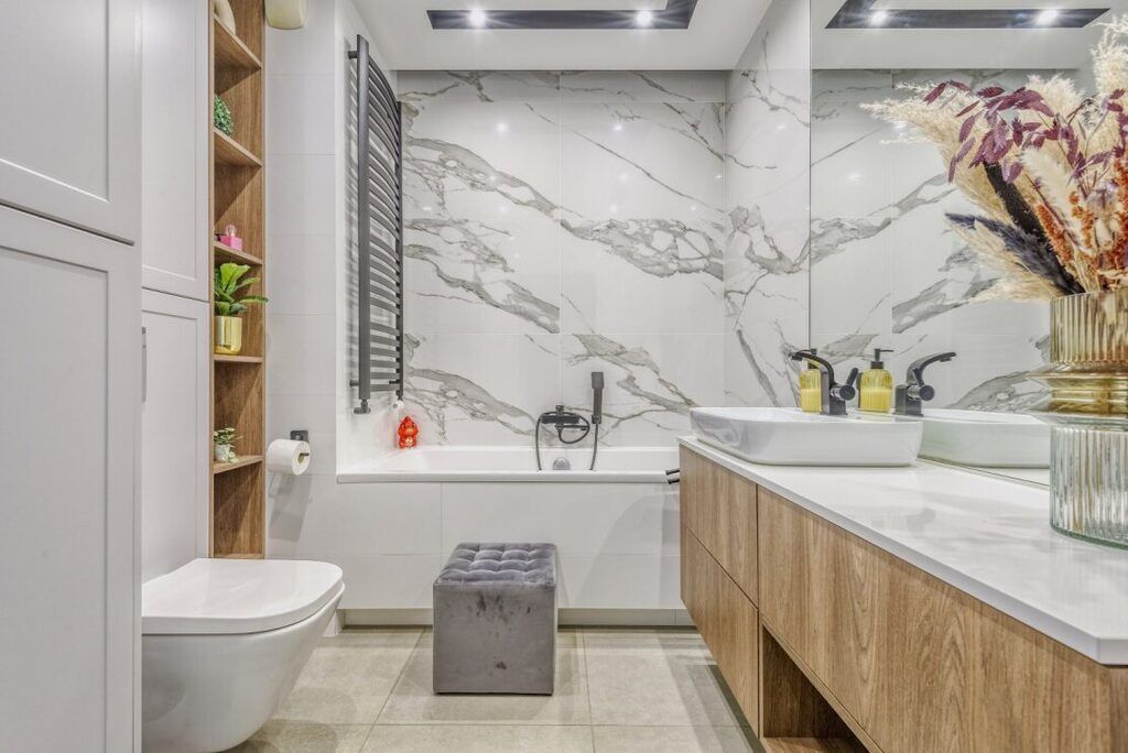 - Dwie łazienki, duży hol, liczne zabudowy