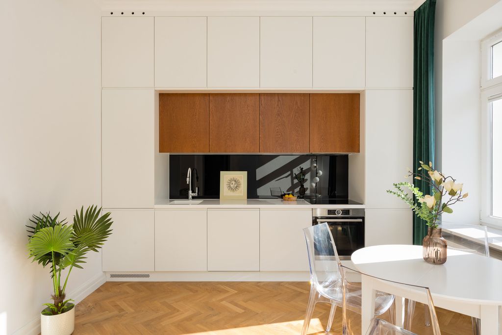 Część dzienna to salon z aneksem kuchennym, zaprojektowany w sposób funkcjonalny i estetyczny. Kuchnia wykonana na zamówienie, z blatem i zlewem z konglomeratu, została wyposażona w wysokiej klasy sprzęt AGD: lodówkę, zmywarkę, piekarnik oraz płytę indukcyjną.