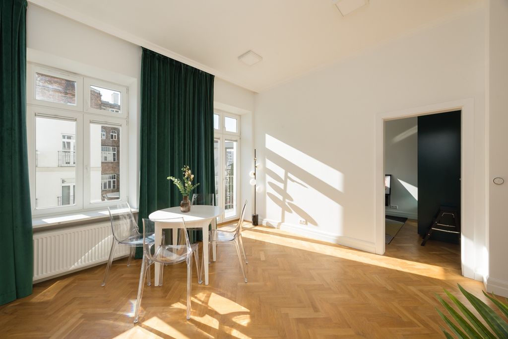 Mieszkanie jest sprzedawane z pełnym wyposażeniem widocznym na zdjęciach, dzięki czemu nowy właściciel może wprowadzić się od razu, bez dodatkowych nakładów. Dodatkowym atutem jest klimatyzacja. Wysokość pomieszczeń wynosi aż 330 cm, co nadaje mieszkaniu reprezentacyjnego charakteru. Na podłogach znajduje się drewniany parkiet w doskonałym stanie.