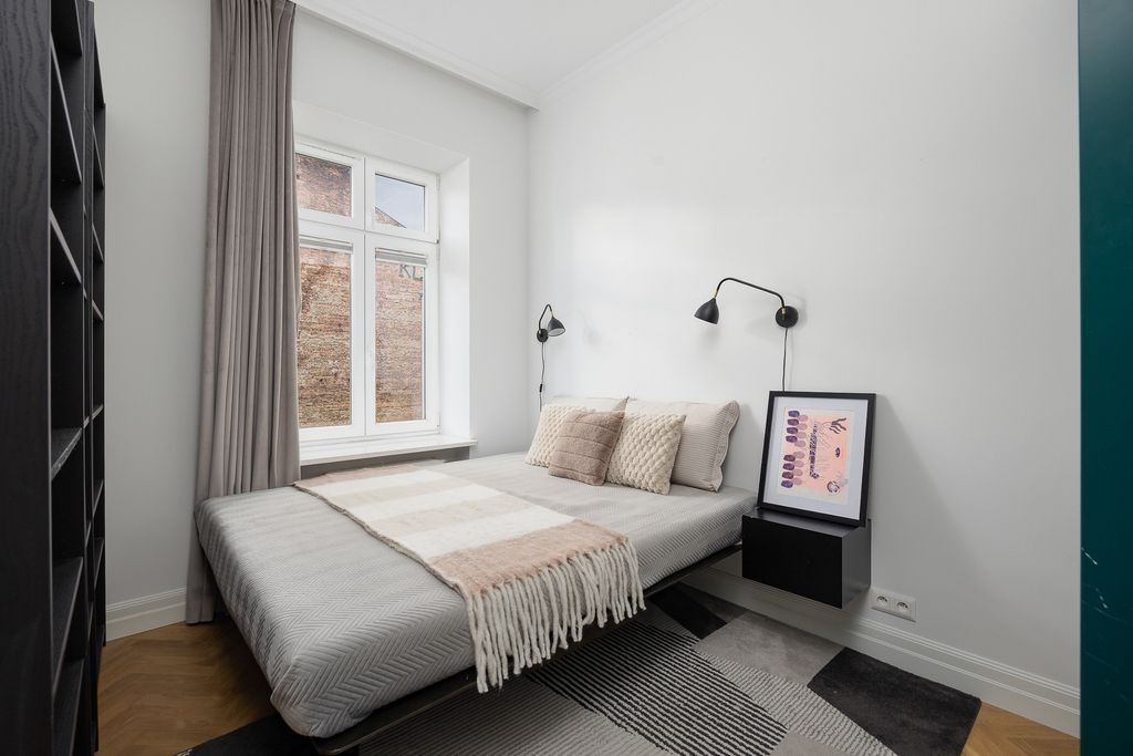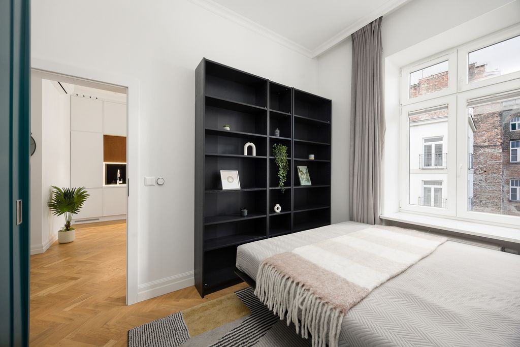 Lokal o powierzchni 35,50 m² został wykończony w podwyższonym standardzie, z wyjątkową dbałością o detale i zachowaniem klimatu przedwojennej architektury. Dzięki południowo-zachodniej ekspozycji okien mieszkanie jest doskonale doświetlone przez cały dzień, a jednocześnie ciche, ponieważ okna wychodzą na wewnętrzny, zadbany dziedziniec.