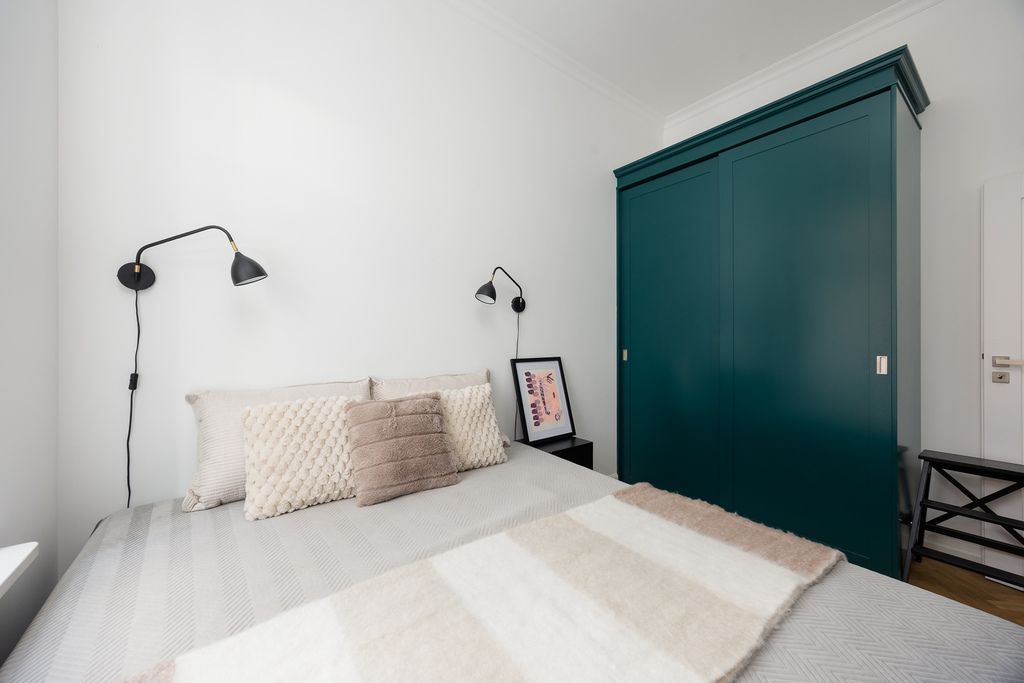 W sypialni znajduje się wygodne, dwuosobowe łóżko oraz pojemna szafa na wymiar, zapewniająca dużą ilość miejsca do przechowywania. Łazienka została urządzona w eleganckim stylu, z wykorzystaniem wysokiej jakości materiałów i przemyślaną zabudową, która gwarantuje komfort użytkowania.