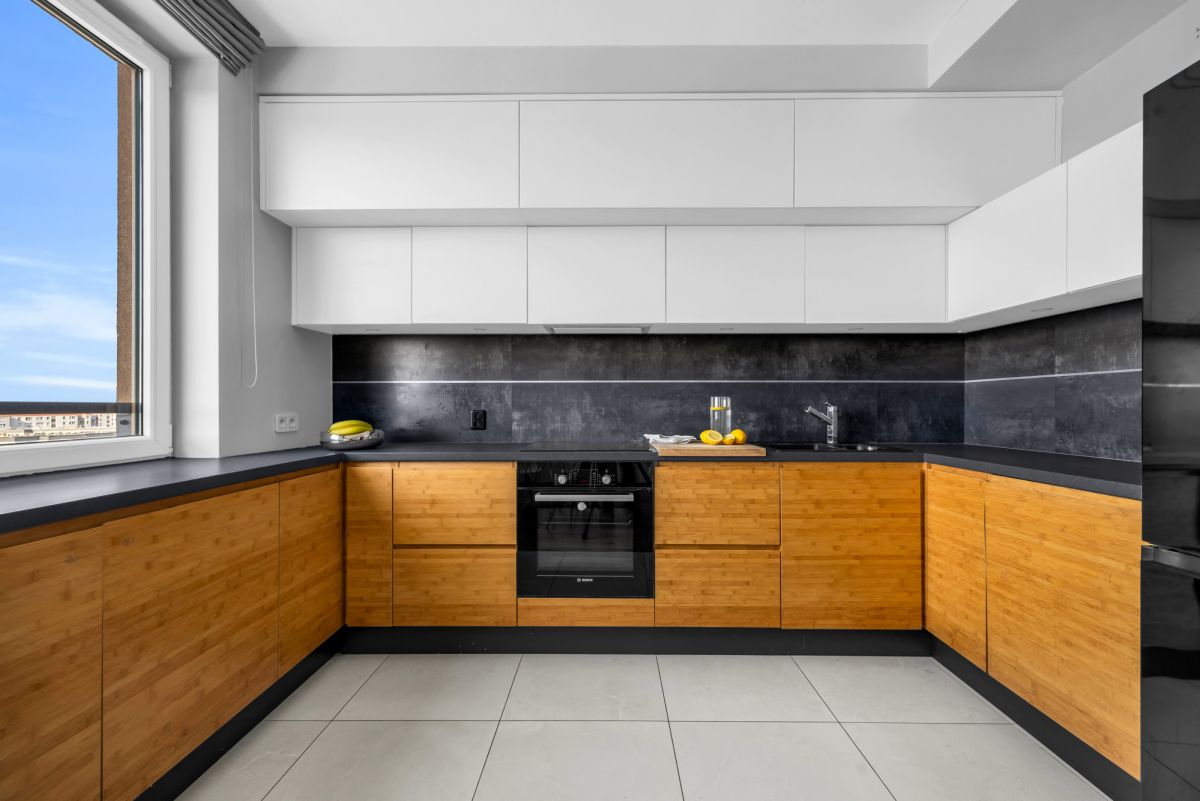 - Salon z otwartą kuchnią - otwarta, słoneczna przestrzeń z dużymi oknami, wyposażona w klimatyzację. Roztacza się stąd niesamowity widok na południowo-zachodnią część Warszawy, w tym Stadion Narodowy oraz pełną panoramę wieżowców w Śródmieściu (Skyline).