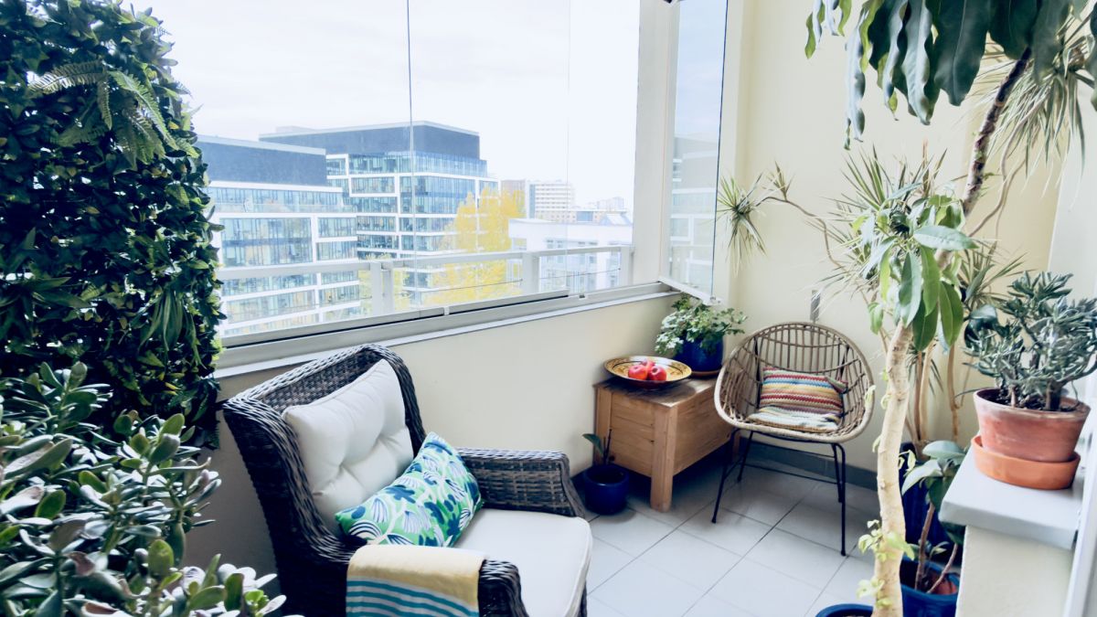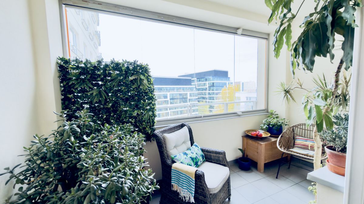 - Zabudowany balkon z widokiem na zielone patio