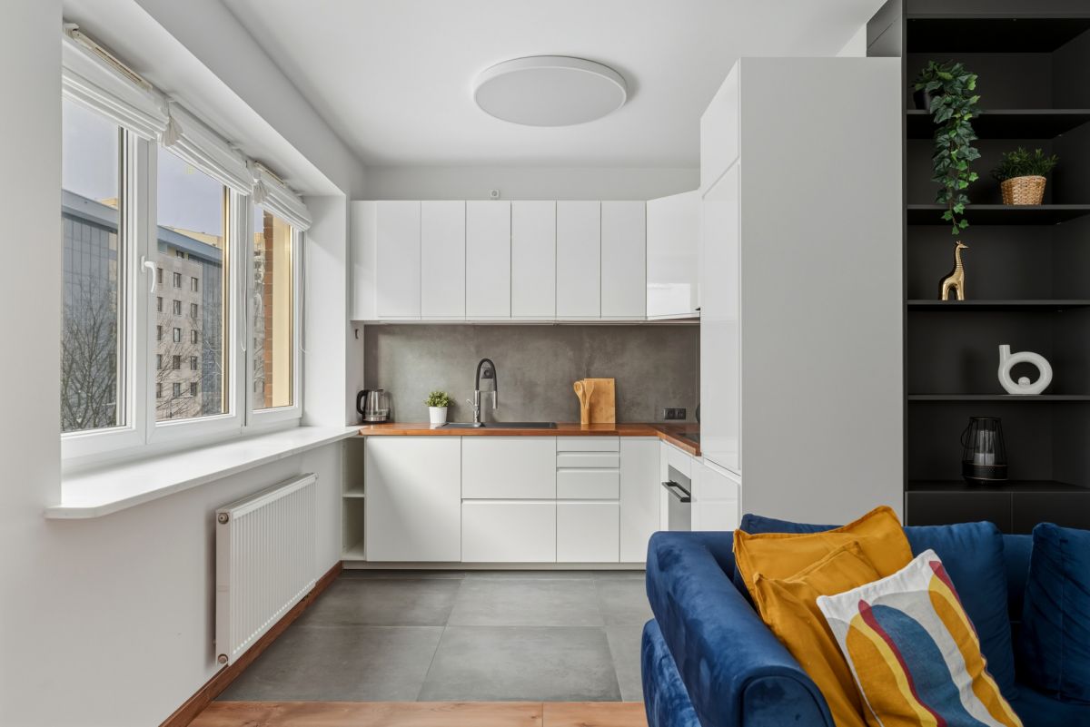 przestronny salon z aneksem kuchennym i wyjściem na taras,