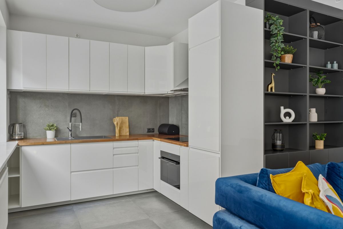Aneks kuchenny został wykonany na zamówienie i wyposażony w pełną zabudowę stolarską oraz wysokiej klasy sprzęt AGD renomowanych producentów. Kuchnia oferuje dużą ilość miejsca do przechowywania oraz komfortową przestrzeń roboczą, co czyni ją zarówno estetyczną, jak i bardzo funkcjonalną.