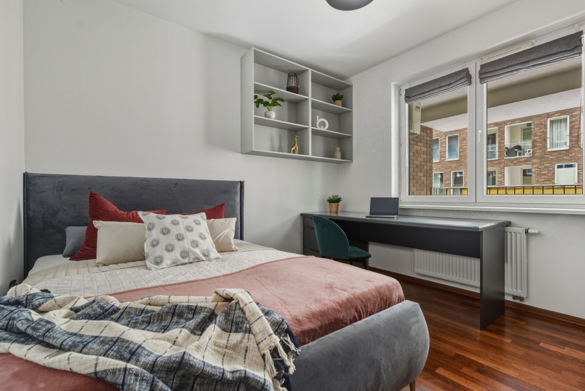Sypialnia stanowi prywatną, spokojną strefę apartamentu. Wyposażona została w klimatyzację, pojemną szafę w zabudowie oraz wykonane na zamówienie duże biurko, co pozwala na komfortową organizację pracy zdalnej bez ingerowania w przestrzeń dzienną.