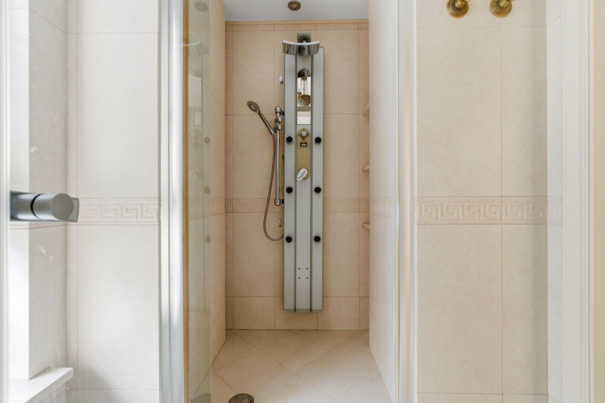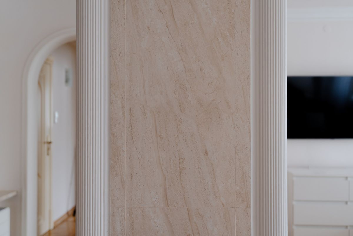- Elementy konstrukcyjne — w tym filary — zostały wykończone w całości naturalnym marmurem Crema Marfil, co podkreśla luksusowy styl nieruchomości i spójność aranżacyjną.