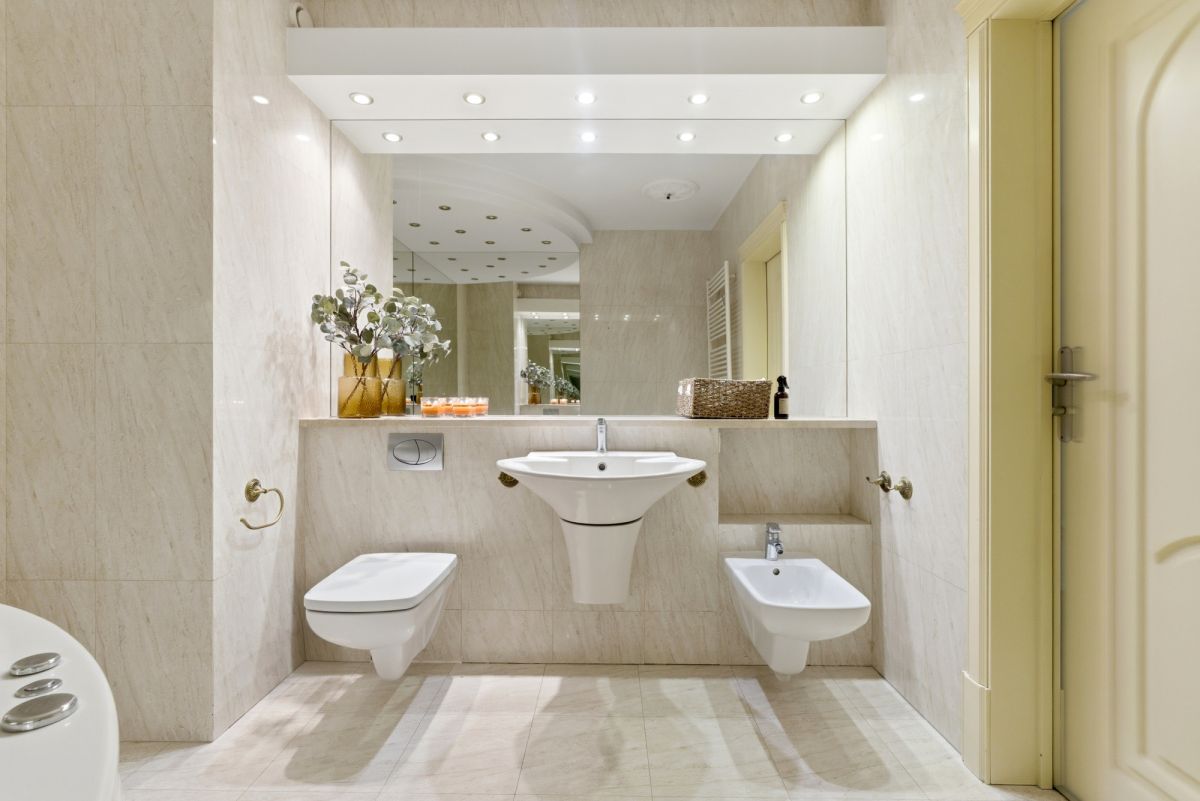 - Łazienka główna w całości wykończona naturalnym marmurem Crema Marfil