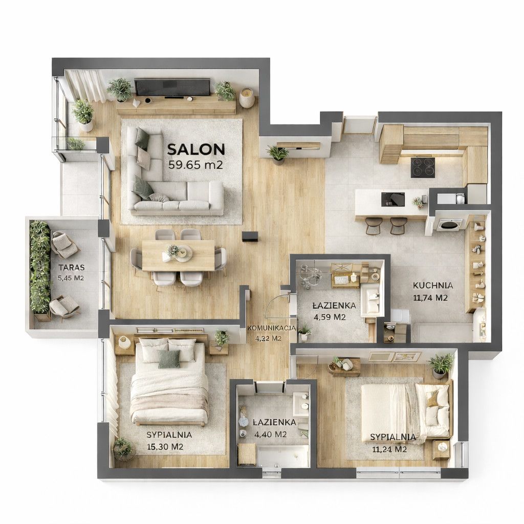 Dodatkowym atutem jest możliwość wydzielenia czwartego pokoju, co daje elastyczność aranżacyjną — idealne rozwiązanie dla rodzin lub osób potrzebujących dodatkowego gabinetu.