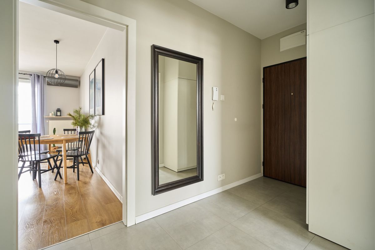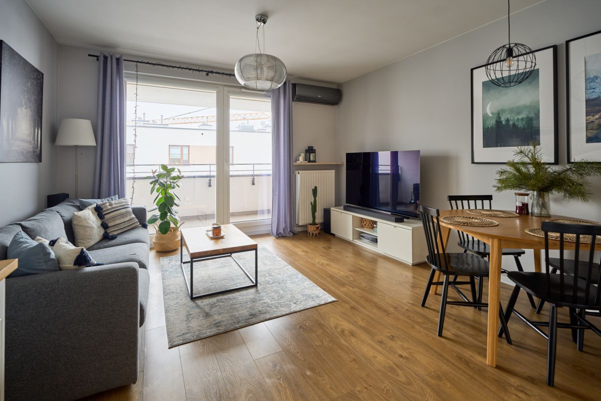 Lokal o powierzchni 59,5 m² składa się z 3 pokoi - w tym salonu z aneksem kuchennym (z którego wyjdziemy do loggii), łazienki i przedpokoju. Niekwestionowanym atutem nieruchomości jest zamontowana klimatyzacja, która podnosi komfort użytkowania w cieplejsze dni, jednocześnie dyskretnie wkomponowując się w urządzoną przestrzeń.