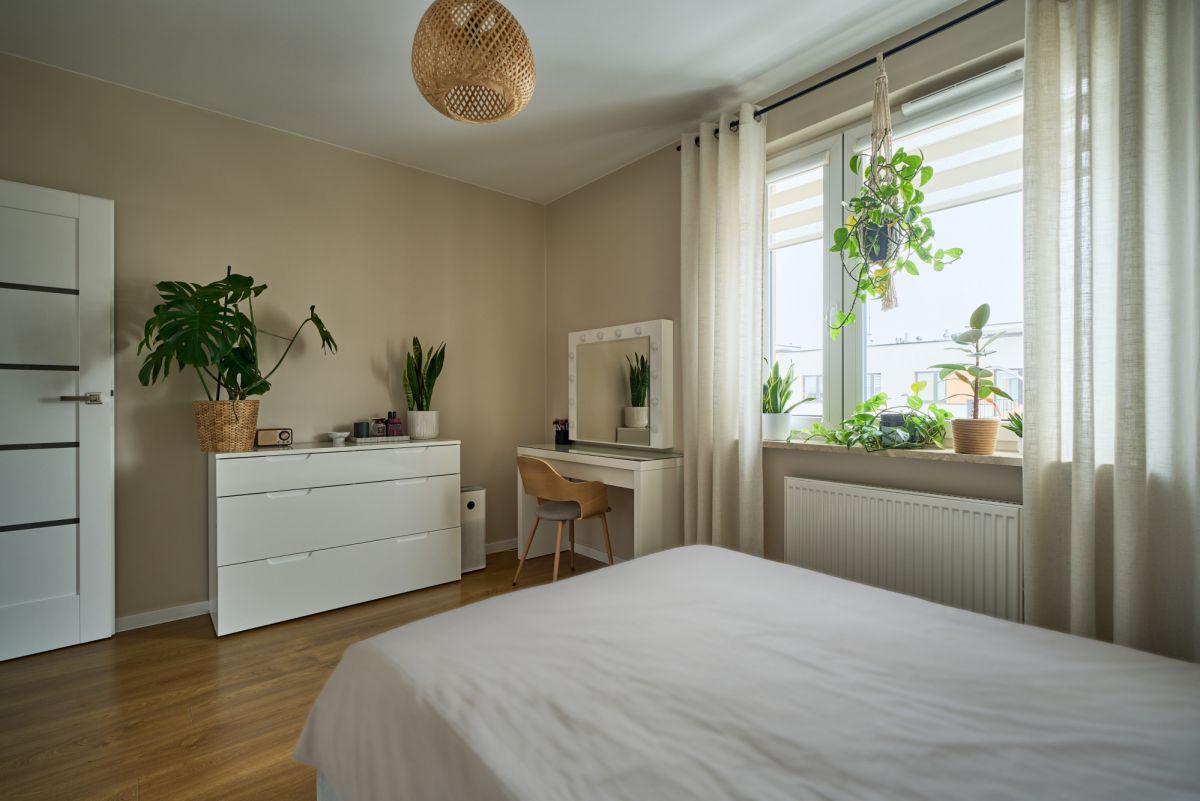 Sypialnia - Klimatycznie urządzona, z dużym łóżkiem sypialnianym tworzy prywatną przestrzeń idealną do wypoczynku. Wygospodarowane zostało również miejsce na toaletkę, w którym może stanąć biurko - zapewniając komfortowe miejsce do pracy. Duże i pojemne szafy wykonane na wymiar przez stolarza dopełniają przestrzeń i gwarantują dużo miejsca.