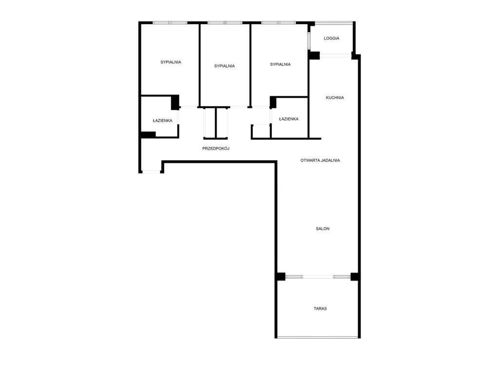 - 4 pokoje: 3 sypialnie duży salon z kuchnią