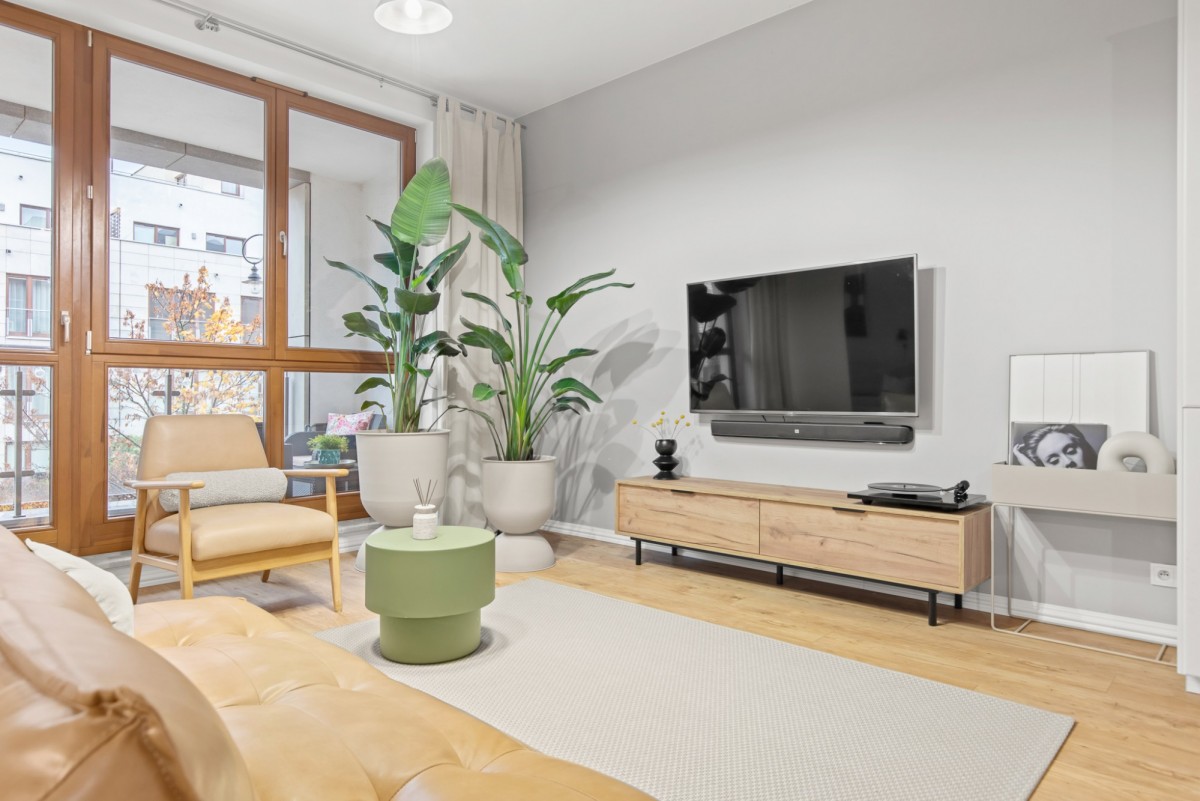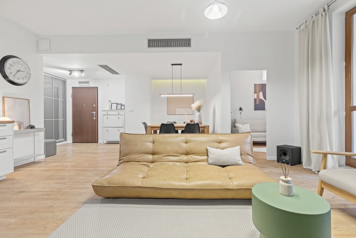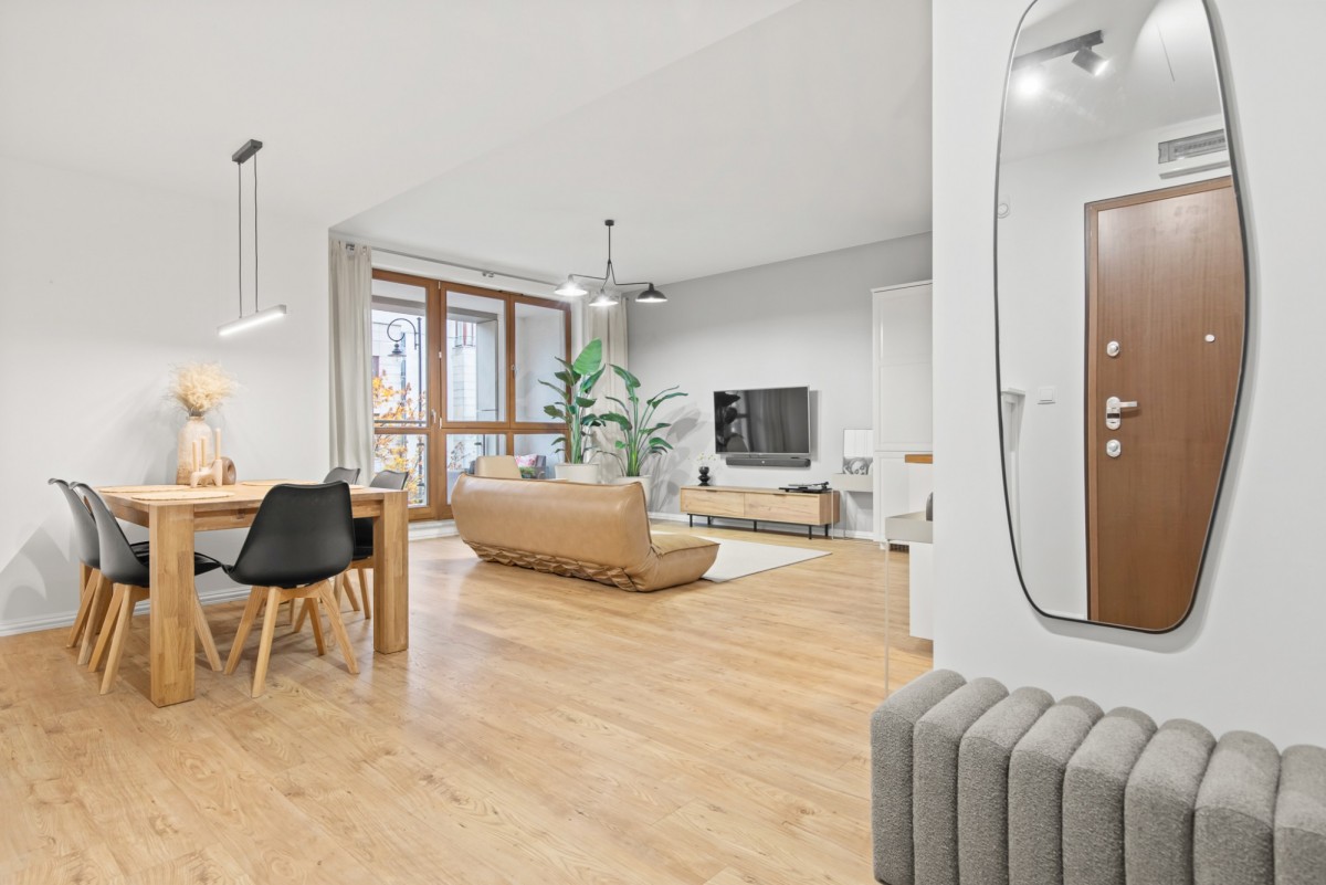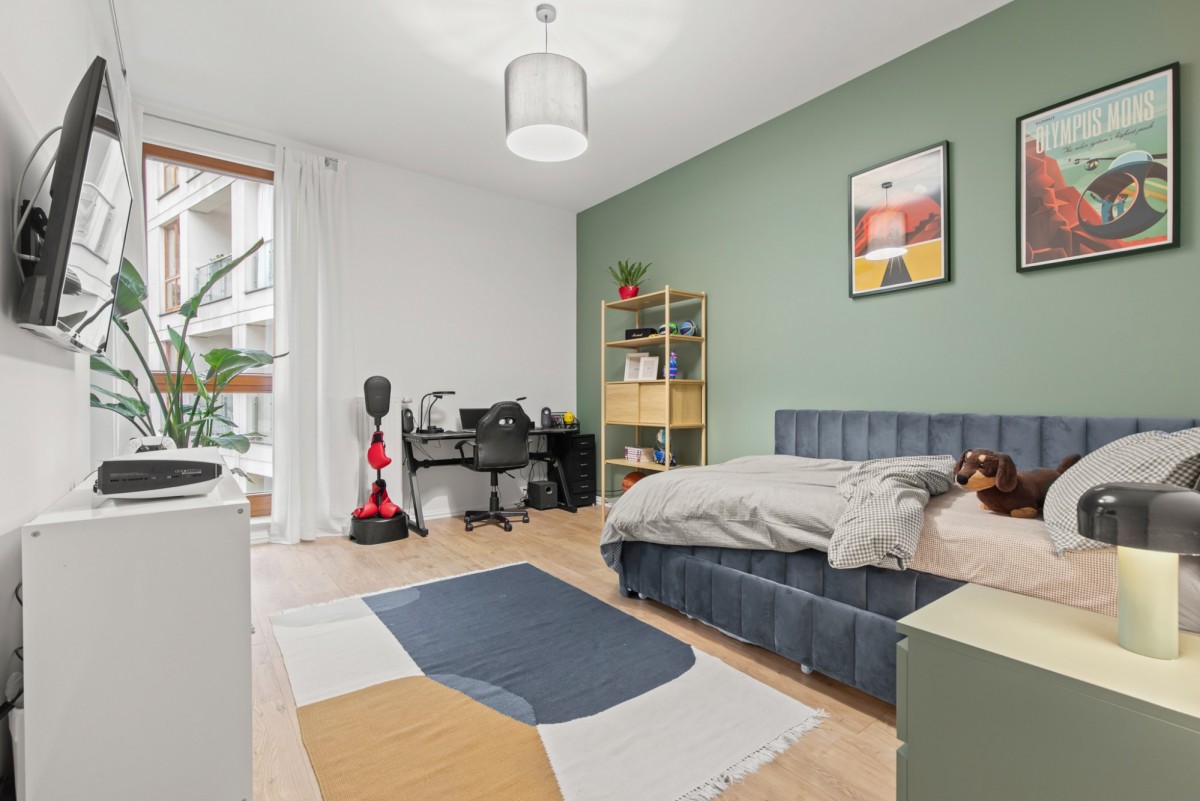 4-pokojowe mieszkanie o powierzchni 90,68 m2 składające się z pokoju dziennego połączonego z jadalnią oraz w pełni wyposażoną kuchnią, sypialni z łóżkiem małżeńskim, 2 pokoi dziecięcych, łazienki oraz schowka z możliwością zrobienia drugiej łazienki. Mieszkanie dwustronne, ciche posiada dwa balkony jeden od strony wewnętrznego patio, z widokiem na zieloną piękna cześć osiedla. Mieszkanie bardzo wysokie na 2,95 m w standardzie znajduje się klimatyzacja.