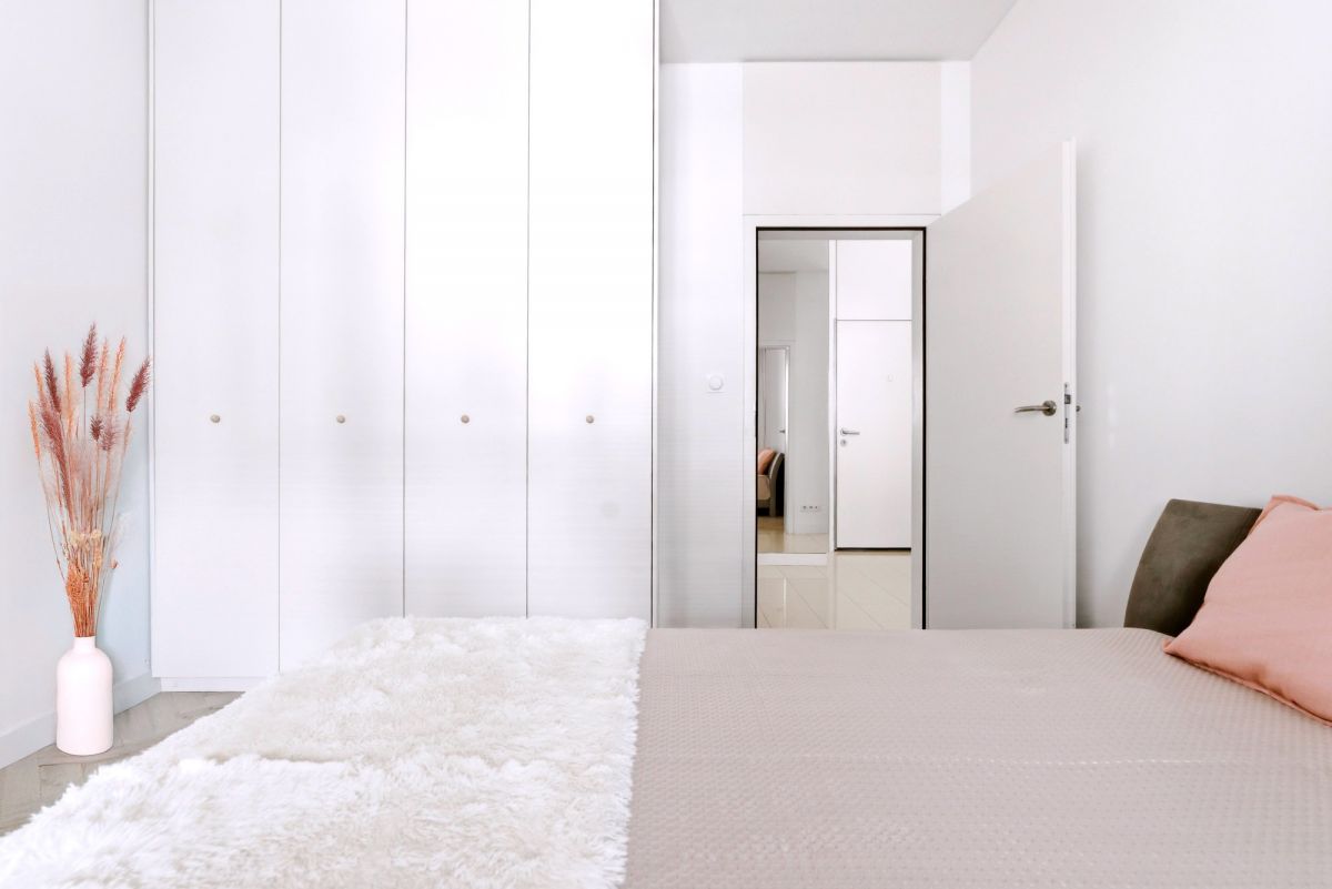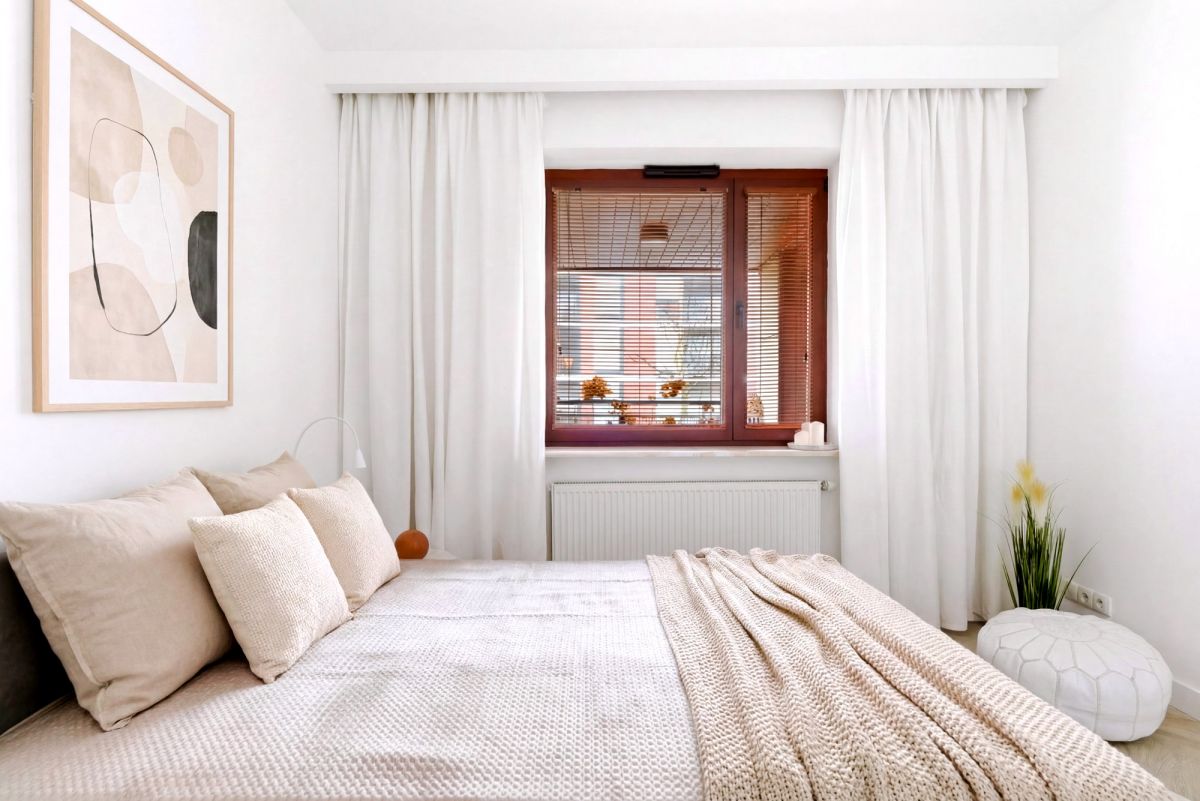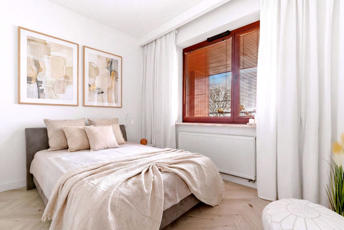 * Elegancka sypialnia wykończona z dbałością o detale, z dużym, wygodnym łóżkiem oraz pojemną szafą,