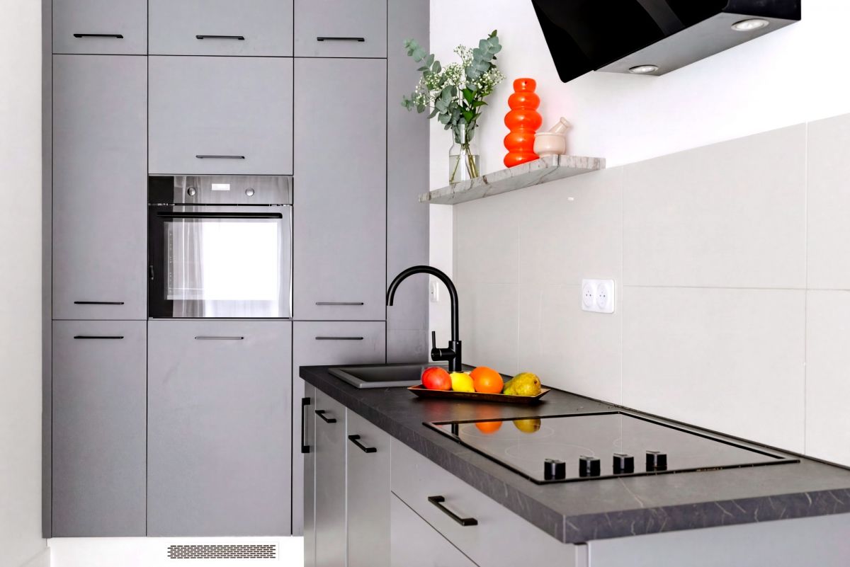 * Przestronna i funkcjonalna strefa dzienna z nowoczesnym salonem, wyjściem na balkon oraz w pełni wyposażonym aneksem kuchennym,