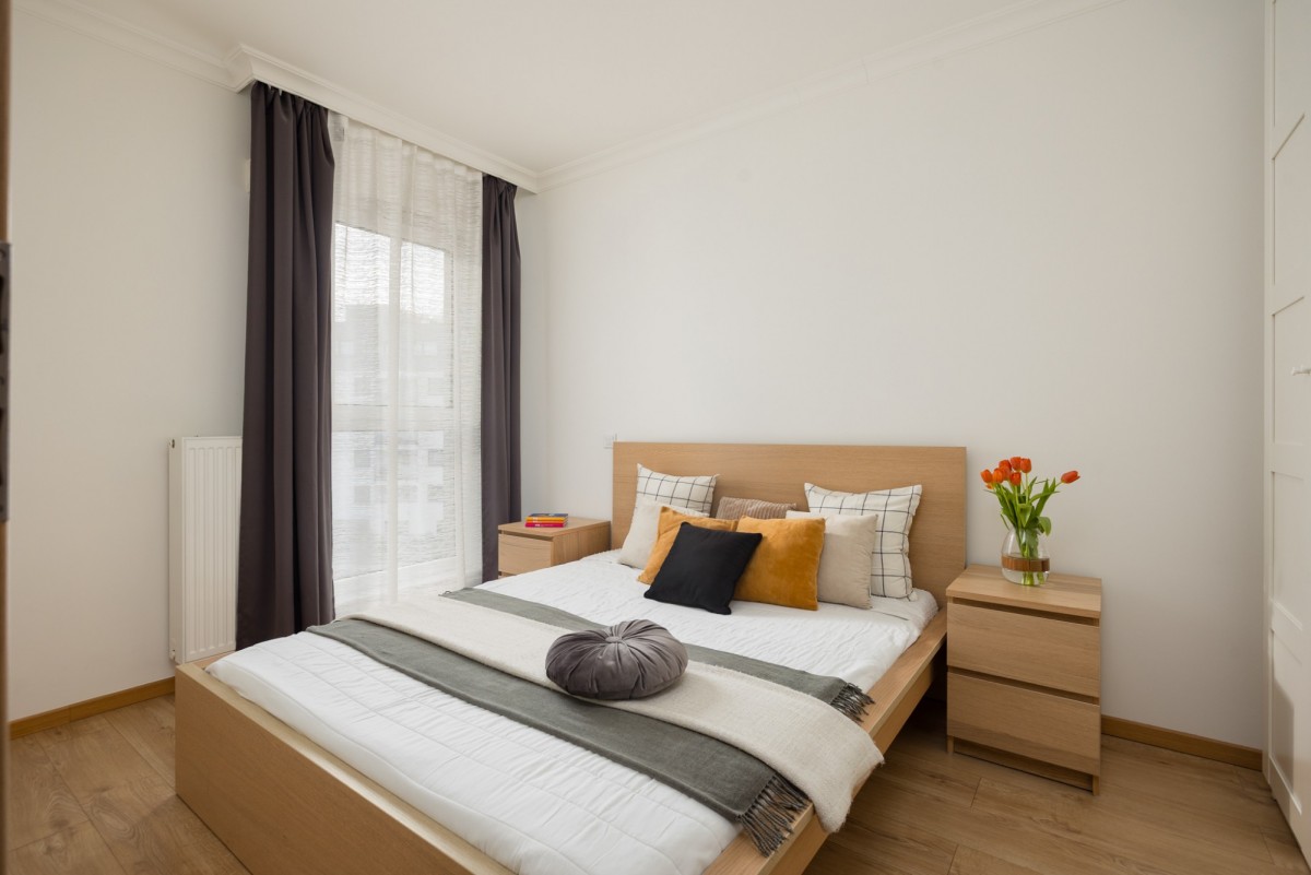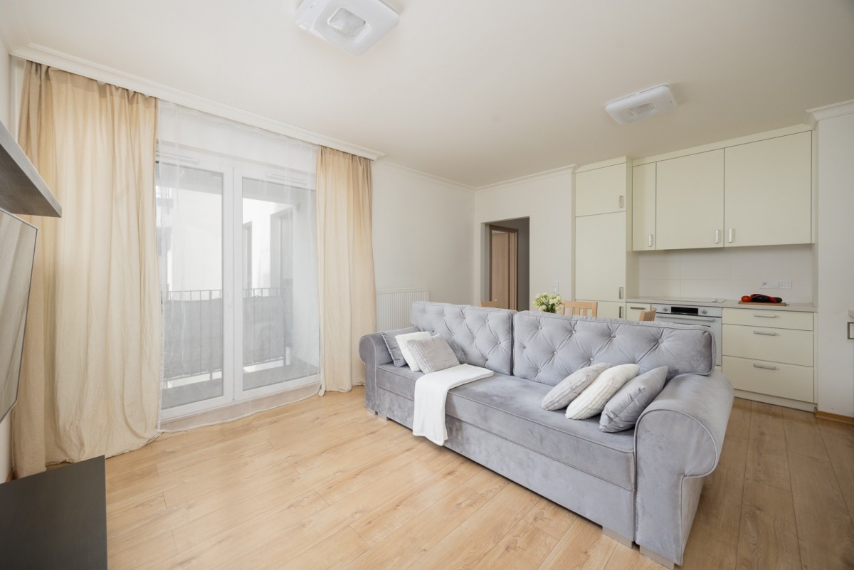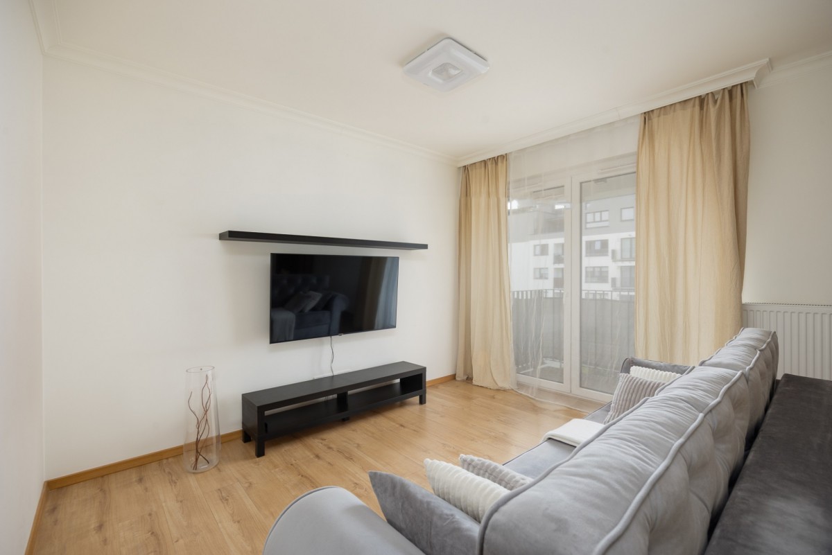 Jasne i słoneczne, wykończone w nowoczesnym standardzie, w pełni wyposażone 2-pokojowe mieszkanie Rozkład i wyposażenie: - salon jasny i słoneczny z wygodną sofą, stołem jadalnianym, komodą, TV;