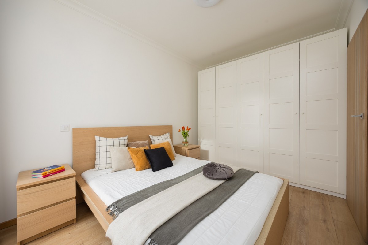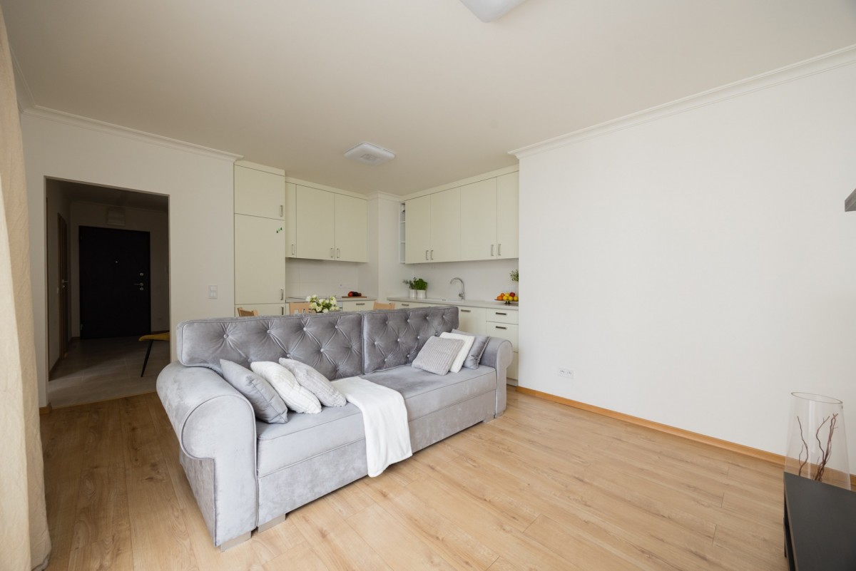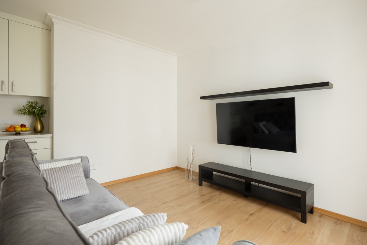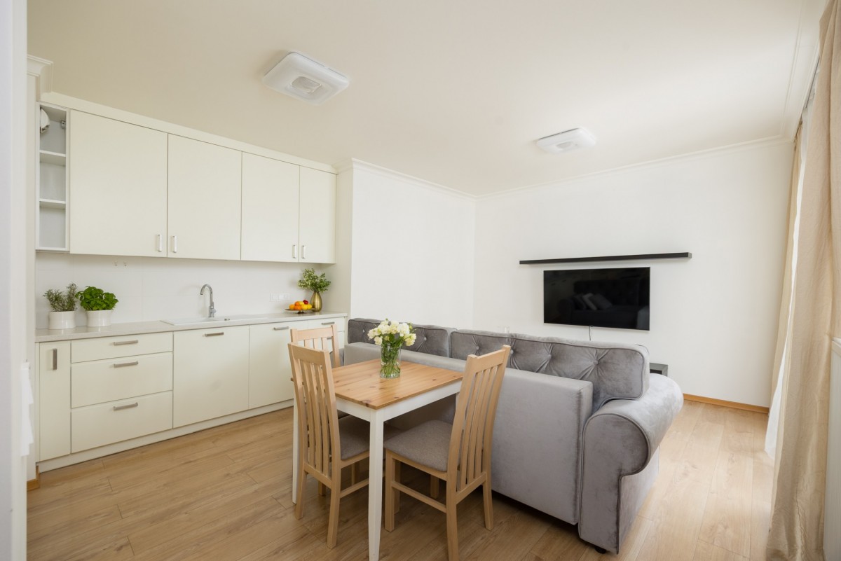 Jasne i słoneczne, wykończone w nowoczesnym standardzie, w pełni wyposażone 2-pokojowe mieszkanie Rozkład i wyposażenie: - salon jasny i słoneczny z wygodną sofą, stołem jadalnianym, komodą, TV;