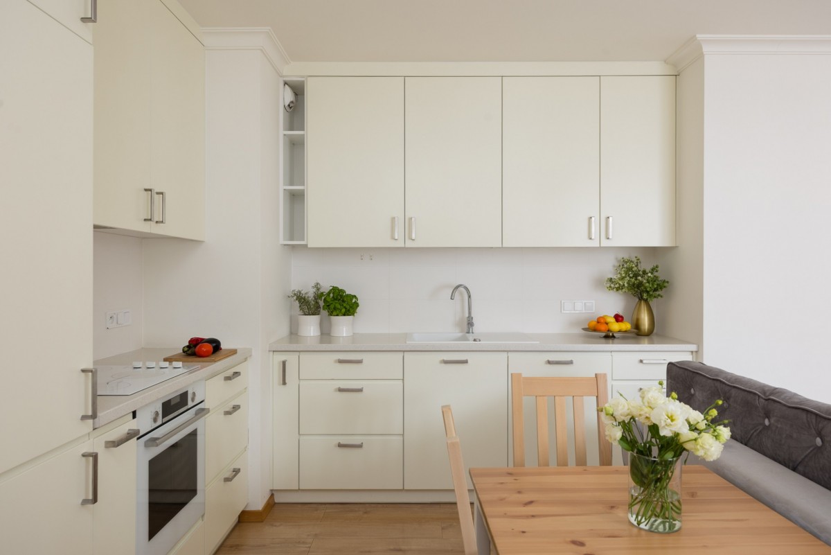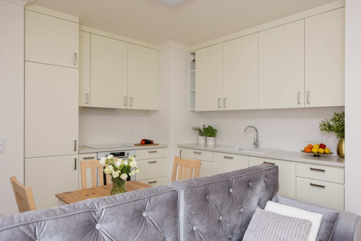 - kuchnia w pełnej zabudowie otwarta na salon wyposażona we wszystkie sprzęty AGD: duża lodówka z zamrażarką, piekarnik i płyta indukcyjna, zmywarka, okap;