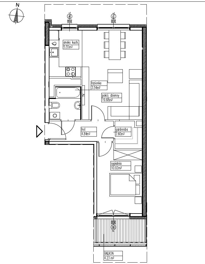 - Salon z aneksem kuchennym, częściowo oddzielonym, z oknami od strony północnej