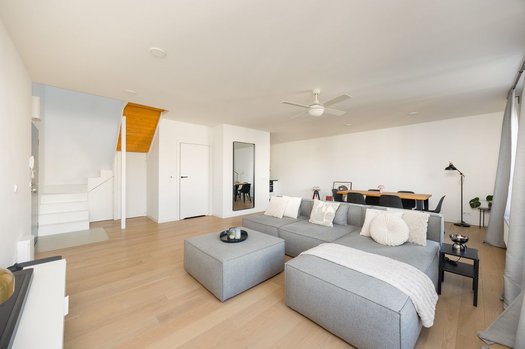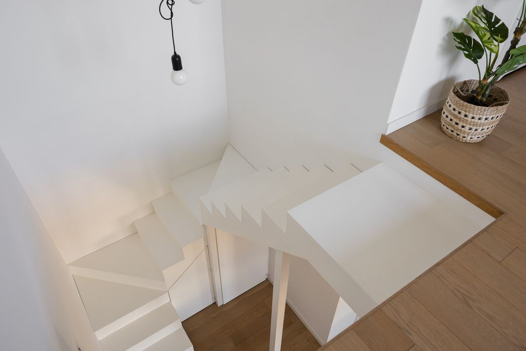 Piękne, symetryczne białe schody stanowią centralny punkt wnętrza i prowadzą na górny poziom. Otwartość przestrzeni między piętrami dodaje mieszkaniu wysokości i lekkości.