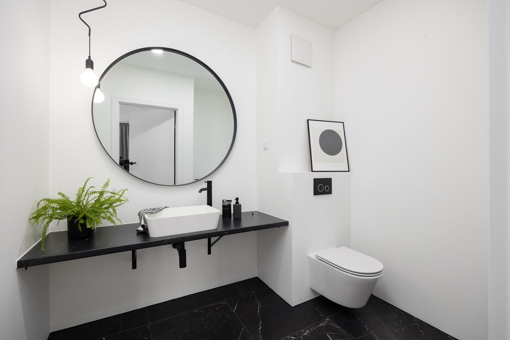 Wnętrze zostało zaaranżowane w stylu nowoczesnego minimalizmu, w odcieniach czerni, bieli i naturalnego drewna. Na podłogach położono dębową deskę warstwową, a w łazienkach – włoski gres.
