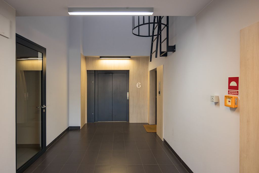 Nowoczesny budynek z 2018 roku wyposażony w windę oraz garaż podziemny. Mieszkanie wychodzi na zielone, wewnętrzne patio, co zapewnia ciszę i spokój mimo miejskiego otoczenia. Otoczenie budynku jest zadbane, a wspólne przestrzenie starannie utrzymane, tworząc przyjemne miejsce do odpoczynku i codziennego życia.