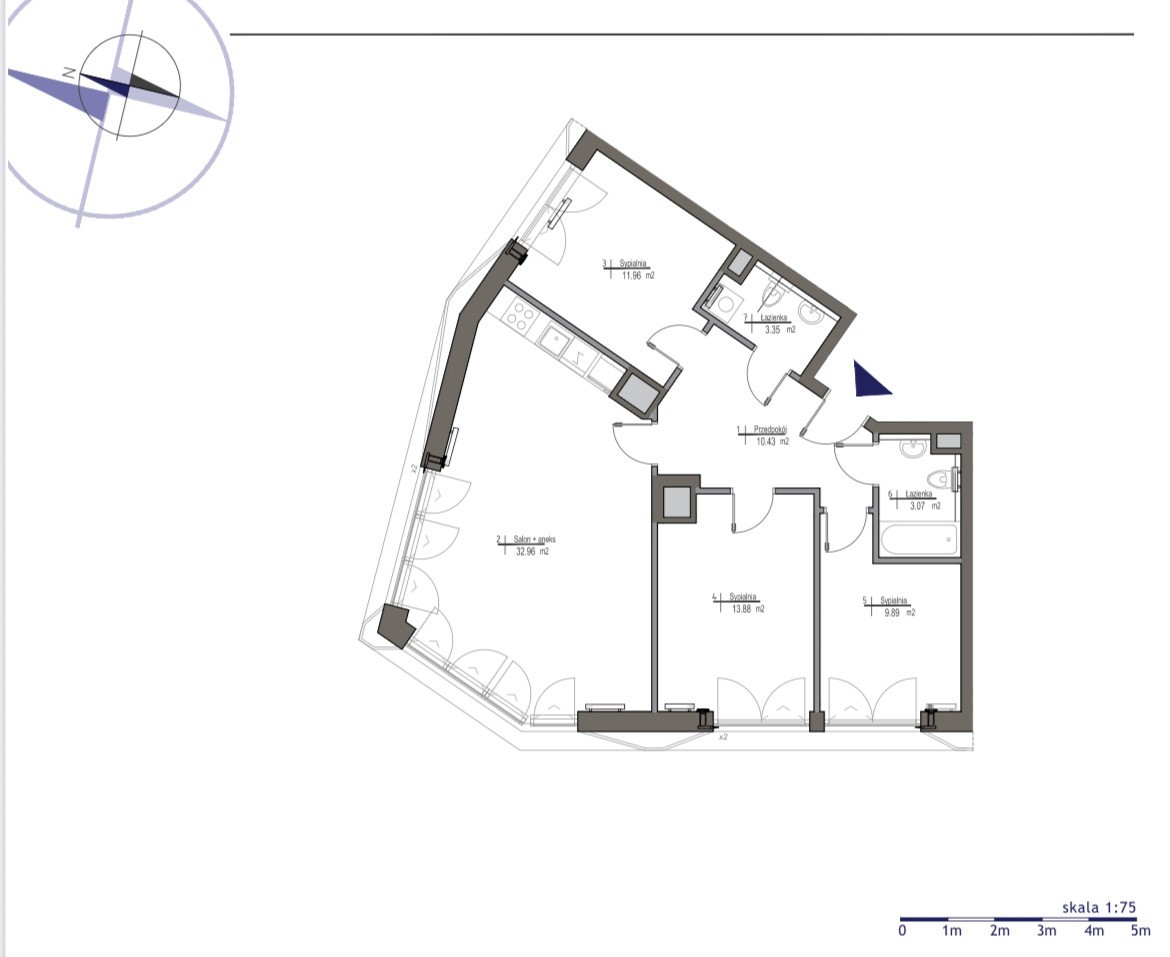 - Przemyślany układ - salon z aneksem kuchennym, trzy sypialnie, łazienka, toaleta i przedpokój z miejscem na zabudowę tworzą wygodne i funkcjonalne wnętrze.