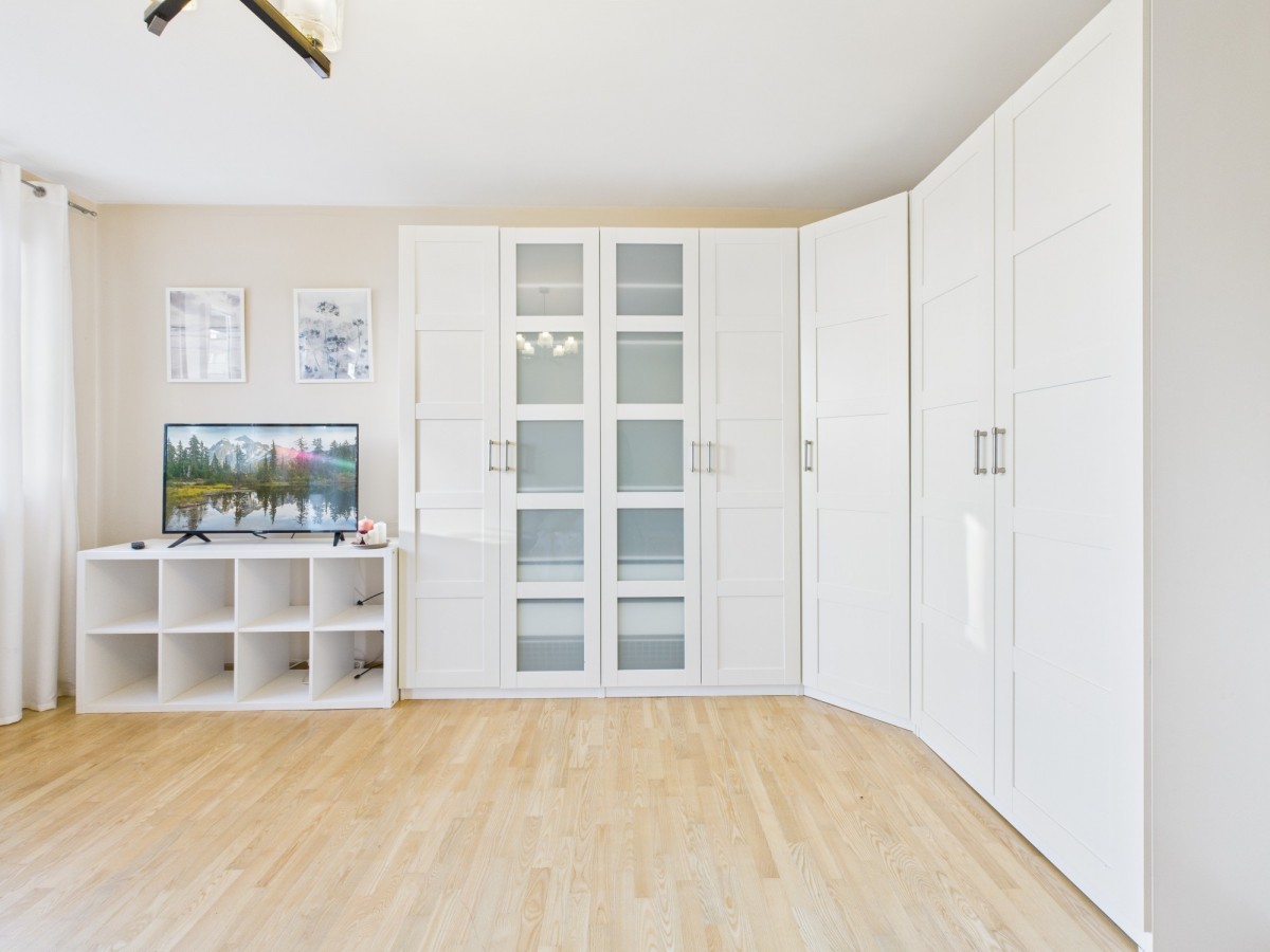 Zarówno w salonie, jak i w sypialni znajdują się bardzo duże szafy.