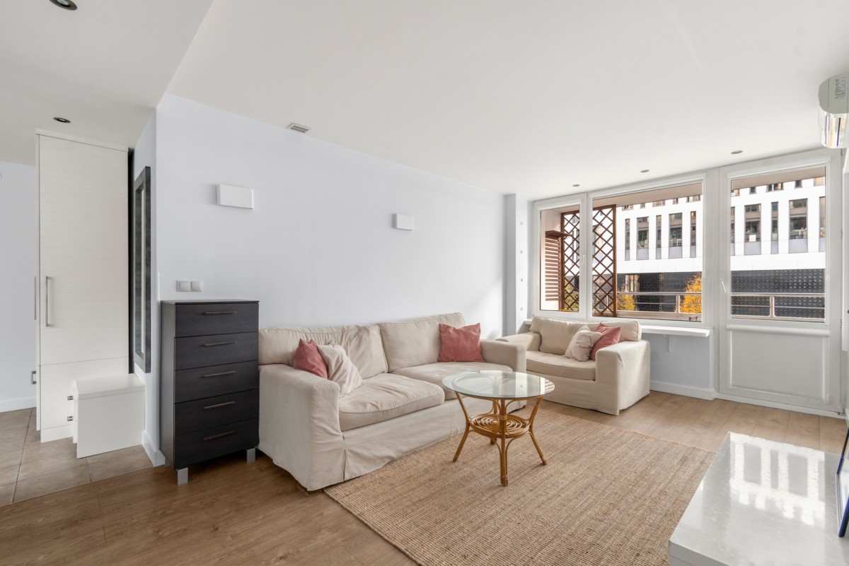 · Bright living room with large windows and access to a wide balcony,
