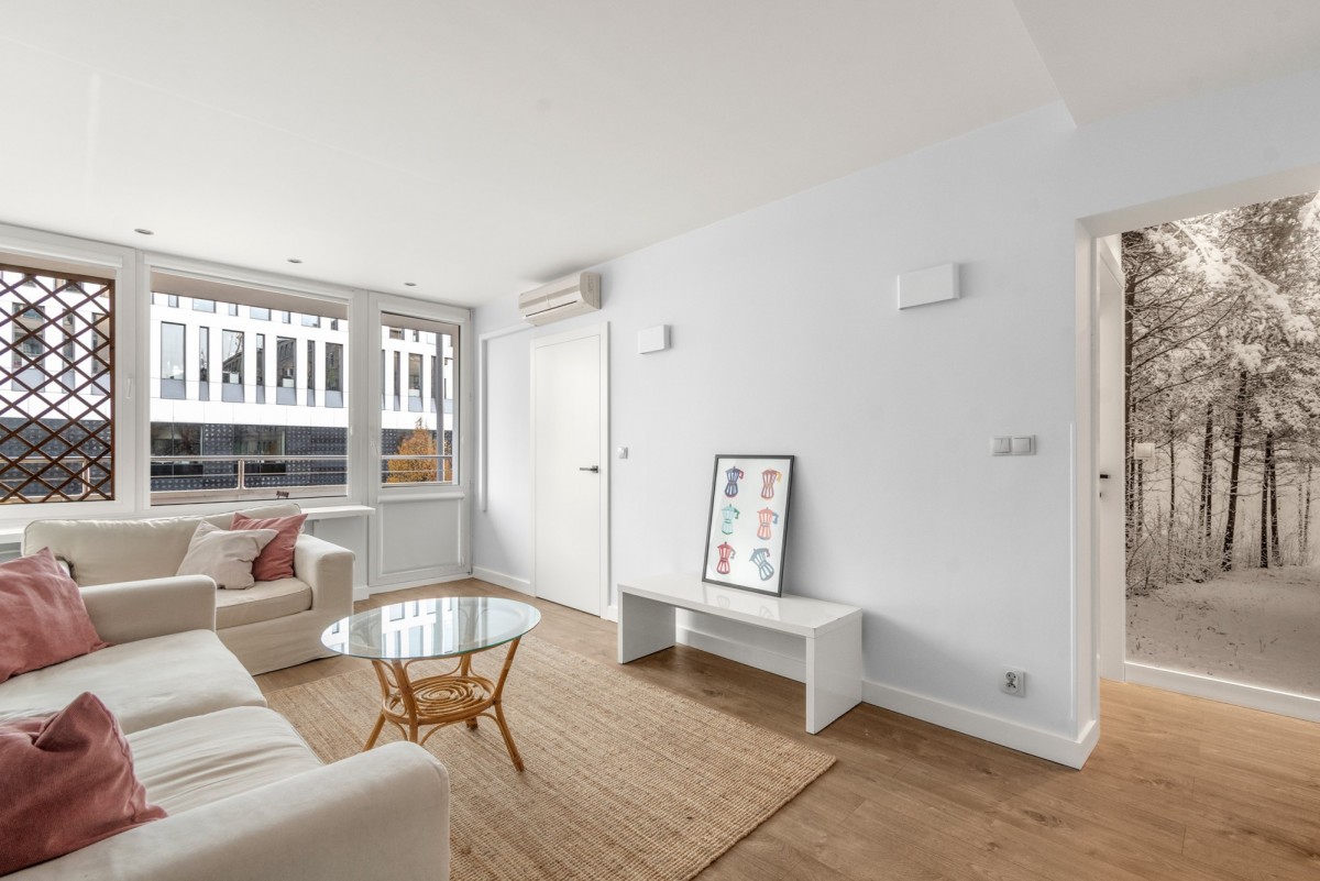 · Jasnego salonu z dużymi oknami i wyjściem na szeroki balkon,