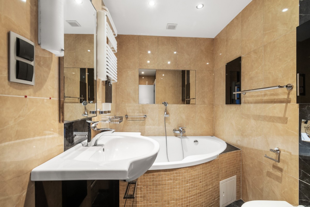 · Comfortable bathroom with bathtub and shower cabin,