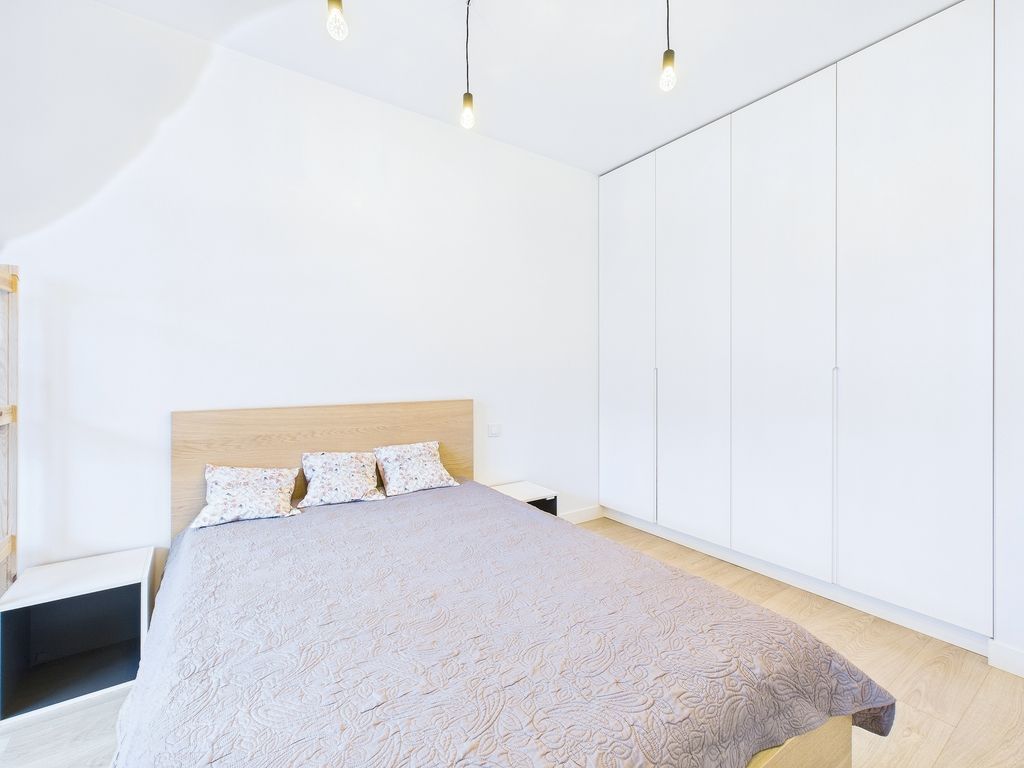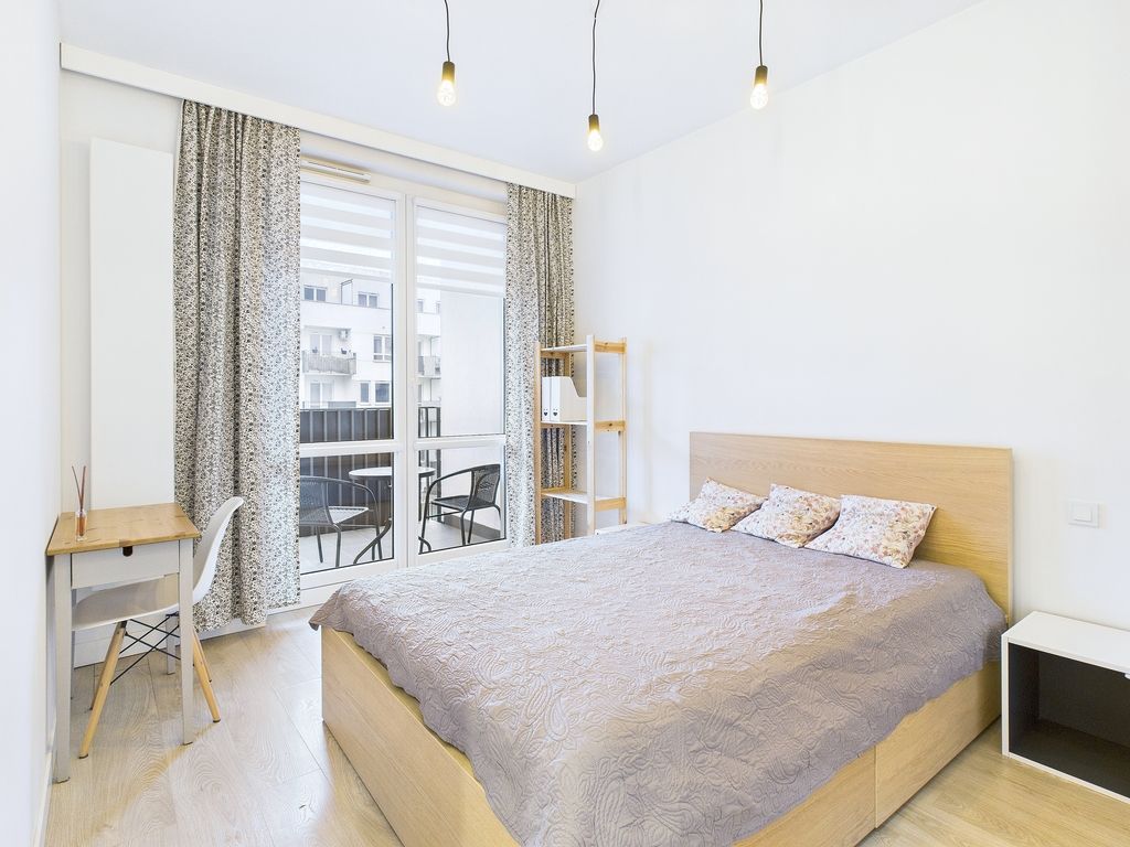 - sypialnia z dużą szafą w zabudowie i łóżkiem małżeńskim oraz wyjściem na balkon,