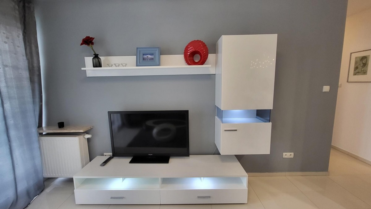 Salon z aneksem kuchennym z wyjściem na dużą loggię, oddzielna sypialnia, łazienka z kabiną prysznicową .
