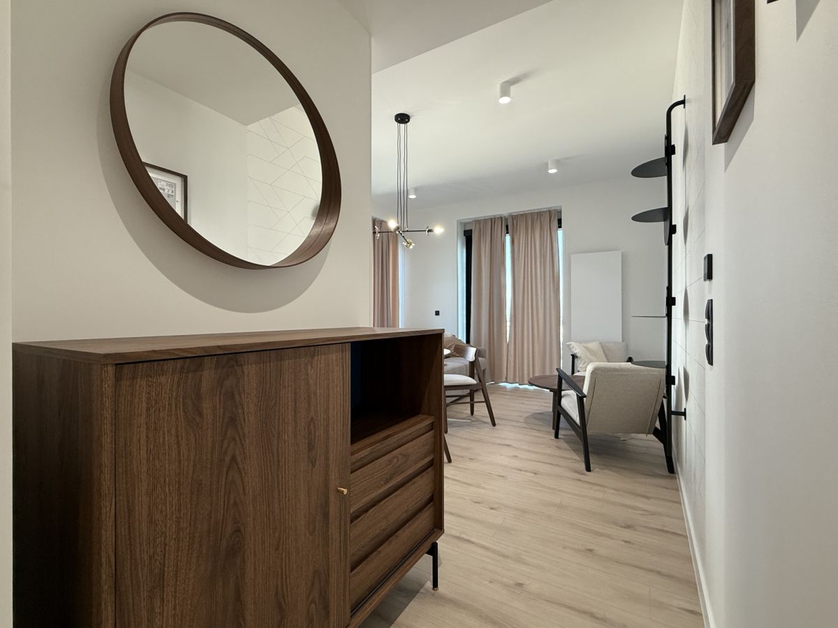 Ten nowoczesny apartament o powierzchni ok 46 m², zaprojektowany przez architekta, składa się z przestronnego salonu z aneksem kuchennym (w pełni wyposażonym w meble i sprzęt AGD), osobnej sypialni, łazienki z wanną oraz korytarza z zabudowaną szafą.