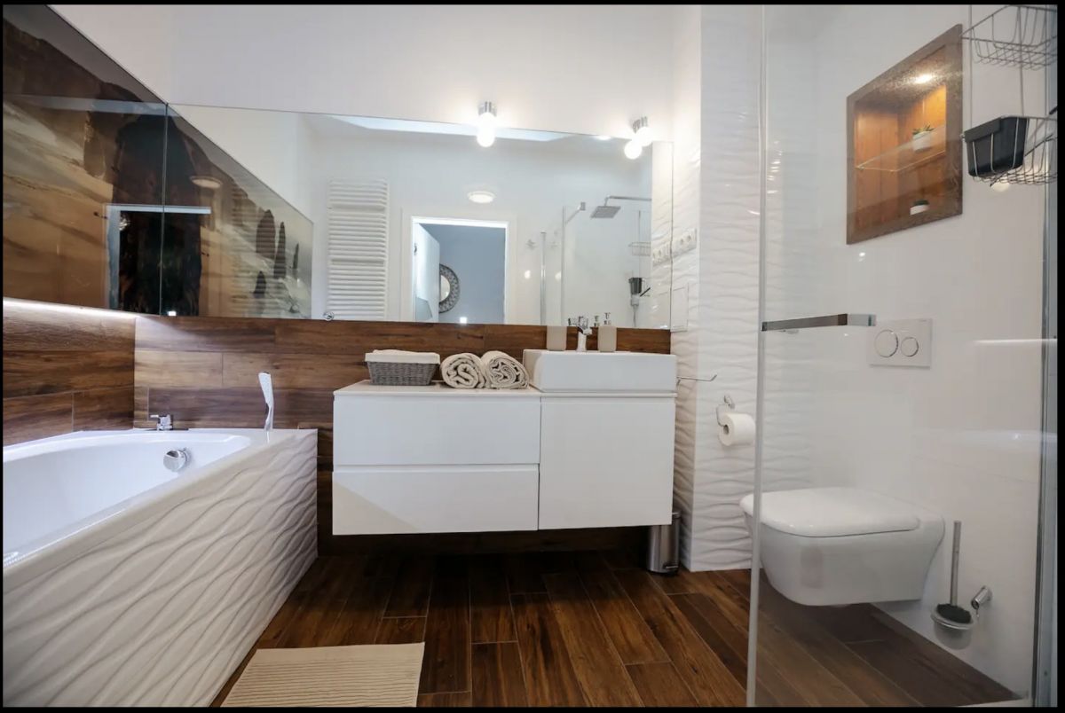 - Eleganckiej łazienki z kabiną prysznicową i wanną,