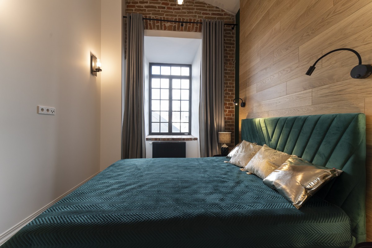 Loft ma 124 m² na jednej kondygnacji. Obejmuje duży salon z aneksem kuchennym, gabinet z biblioteką, dwie sypialnie, łazienkę z toaletą oraz pralnię. W mieszkaniu działa klimatyzacja i wentylacja mechaniczna. Okna wychodzą na wschód, a widok obejmuje neogotycki kościół farny oraz magistrat z początku XX wieku. Wysokie sufity 3,9 m tworzą wyjątkowy klimat wnętrza.