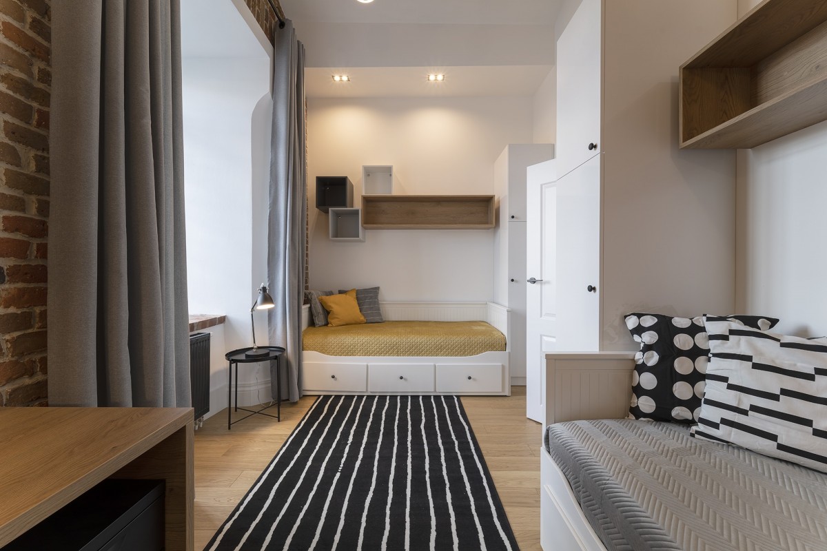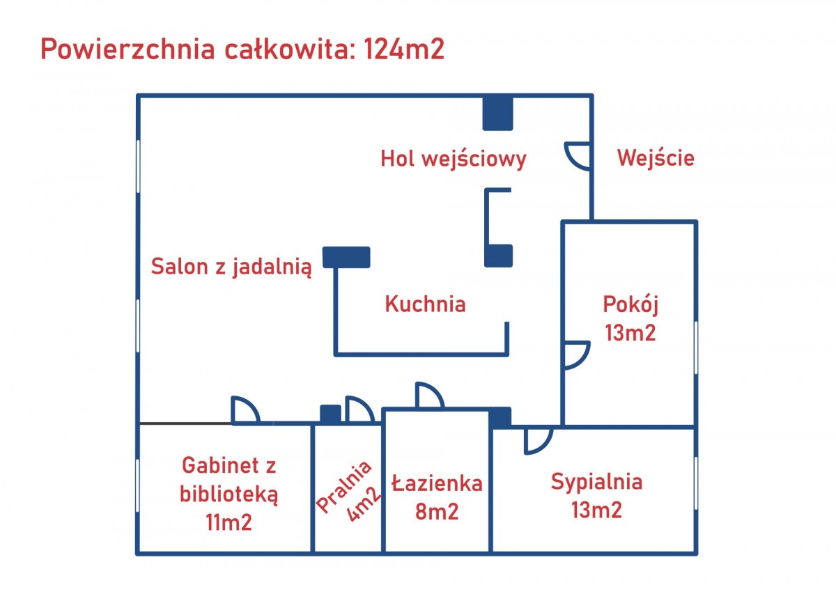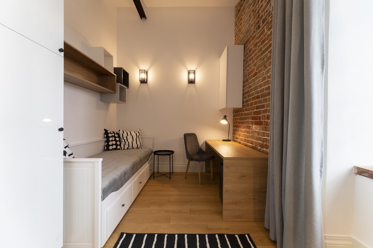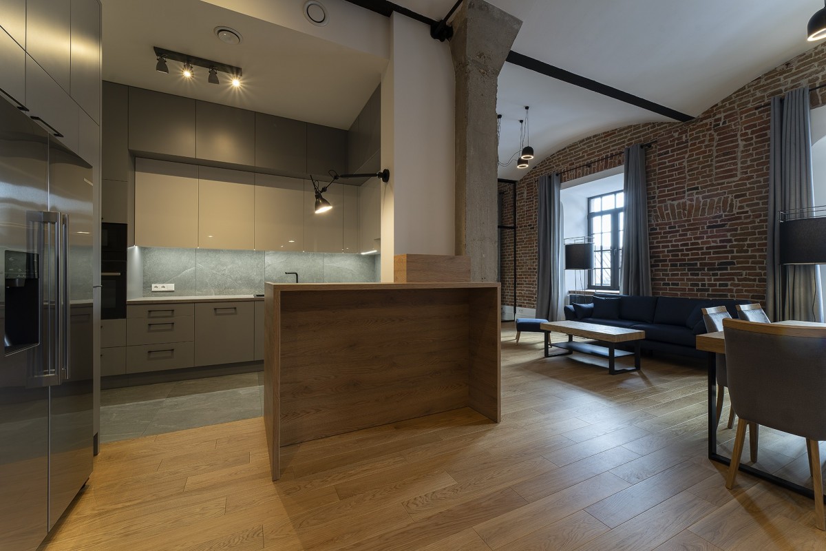Apartament został zaprojektowany przez architekta wnętrz i jest w pełni umeblowany. W kuchni znajdują się nowoczesne urządzenia AGD oraz zabudowa wykonana na wymiar. W pokojach ustawiono stylowe meble, a na podłogach położono dębowe deski. W kuchni, łazience i pralni zastosowano estetyczne płyty. Całość utrzymano w klasycznej kolorystyce, którą miejscami ożywia ceglana czerwień.