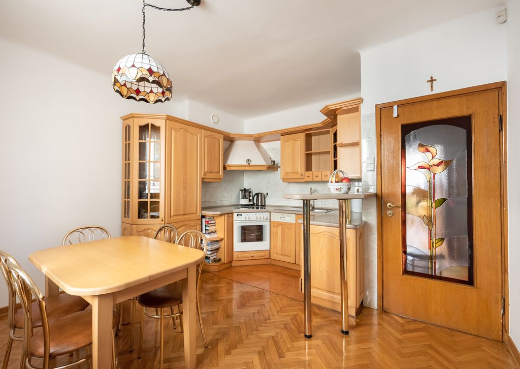 Na parterze znajduje się łazienka z kabiną prysznicową, przestronny, jasny salon oraz oddzielna duża kuchnia z jadalnią. Parter wyłożony terakotą, za wyjątkiem łazienki i części kuchni wyłożonej płytkami. W salonie piękny parkiet.