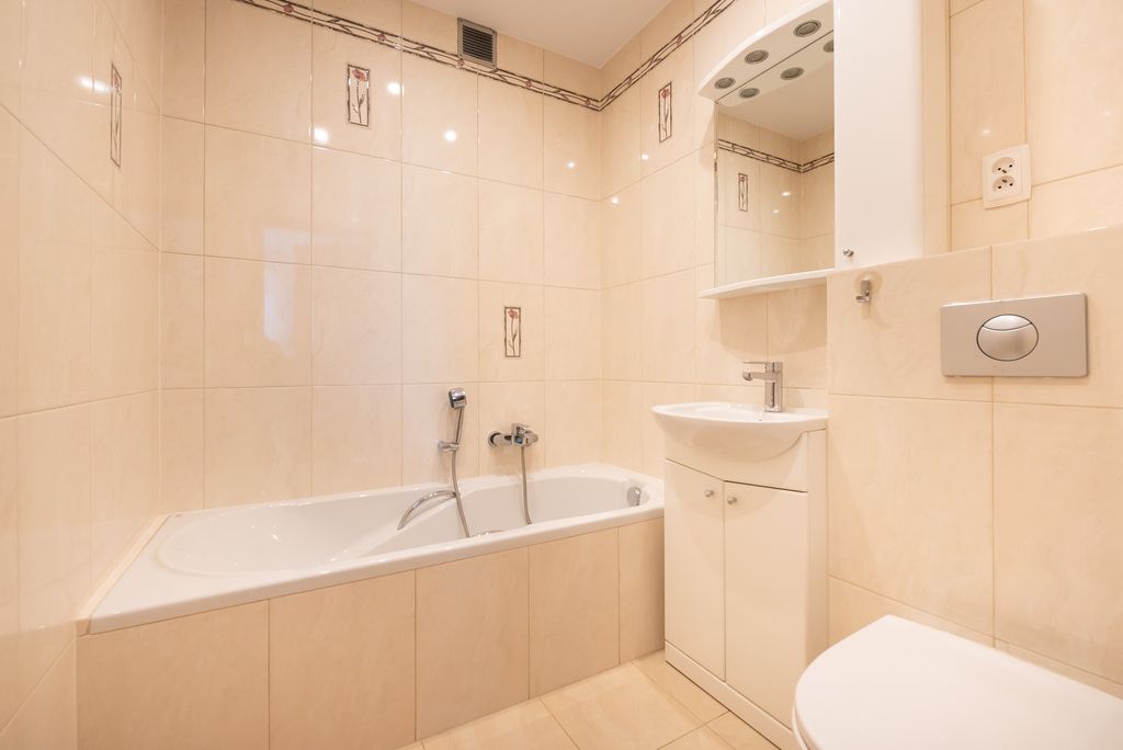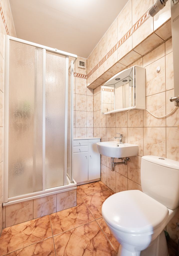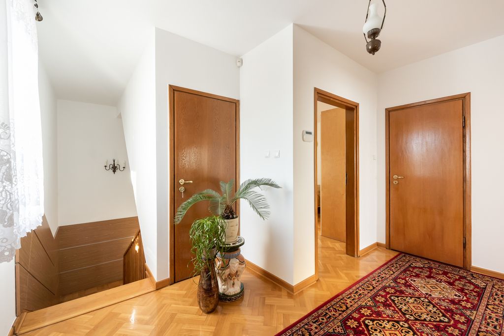 Na 1 piętrze są 3 pokoje od 10 do 16 mkw: sypialnia z wyjściem na balkon, sypialnia gościnna oraz pokój - gabinet. Łazienka z wanną. Wszystkie pomieszczenia łącznie z korytarzem wyłożone są terakotą. W toalecie płytki. Wszystkie pomieszczenia mają duże okna co doskonale doświetla wnętrze.