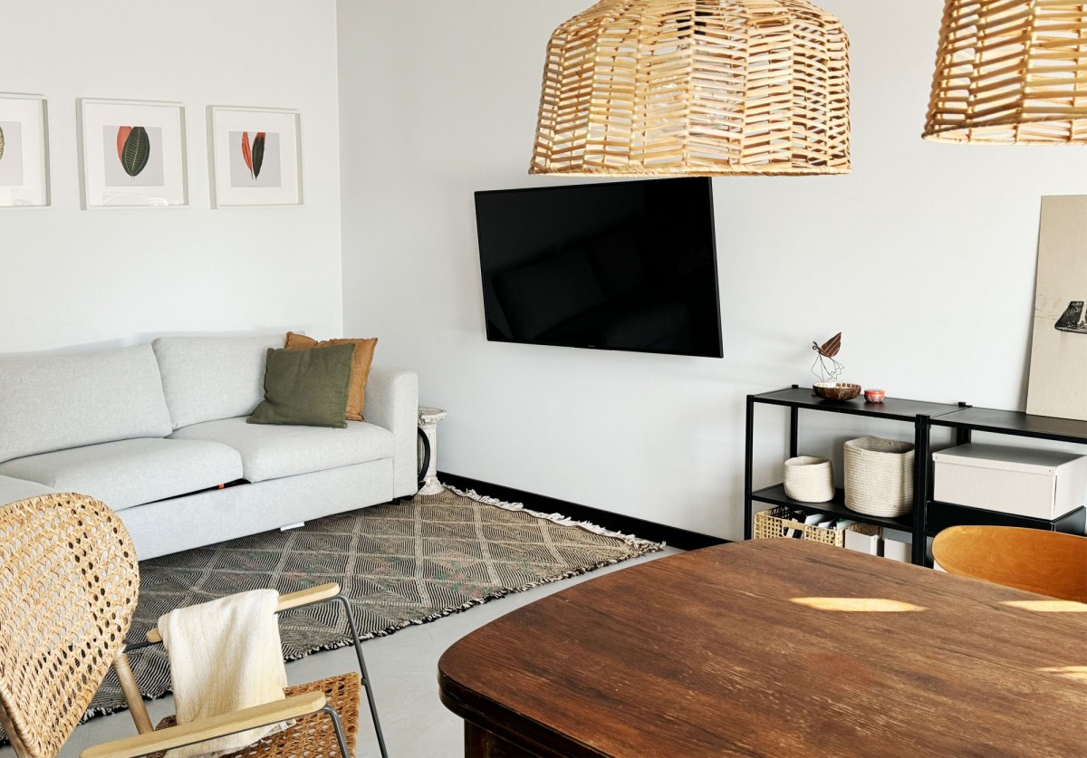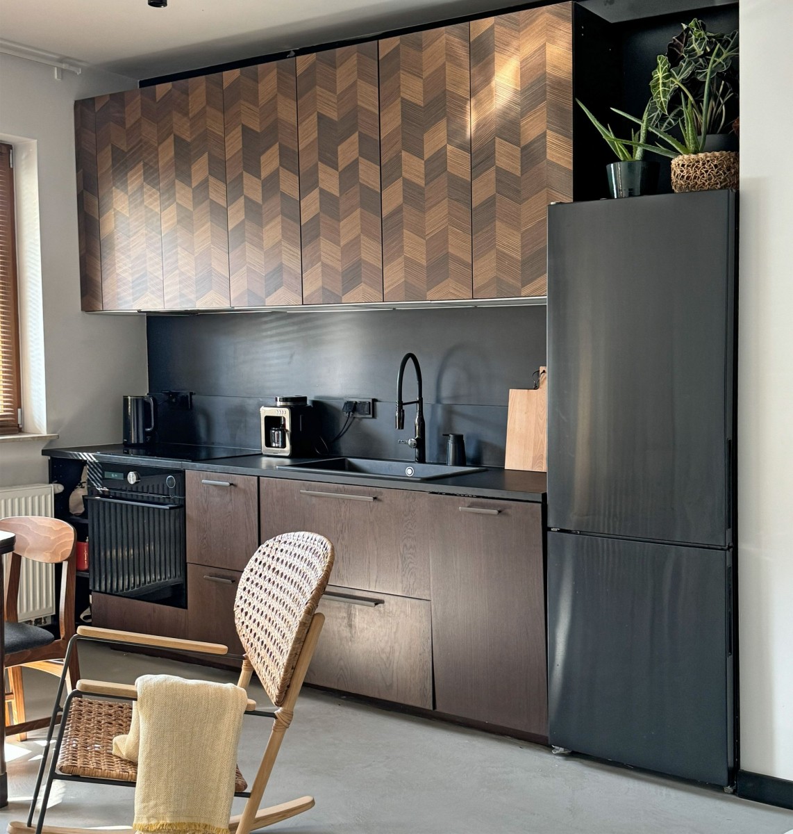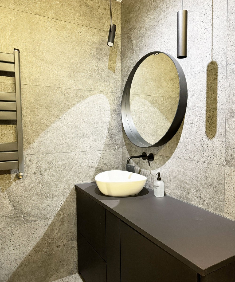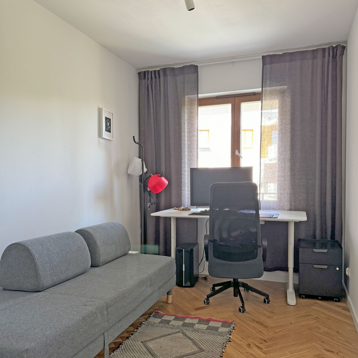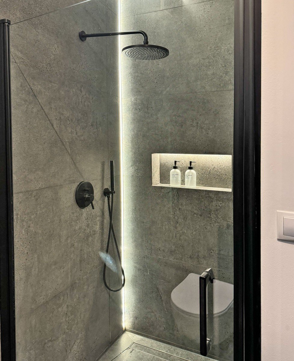 Na podłodze w sypialniach znajduje się ponadczasowy parkiet dębowy. Na podłodze w pozostałej części mieszkania mamy doskonałej jakości mikrocement, który zapewnia wysoki komfort użytkowania oraz dodaje nowoczesnego, minimalistycznego wyglądu wnętrzu.