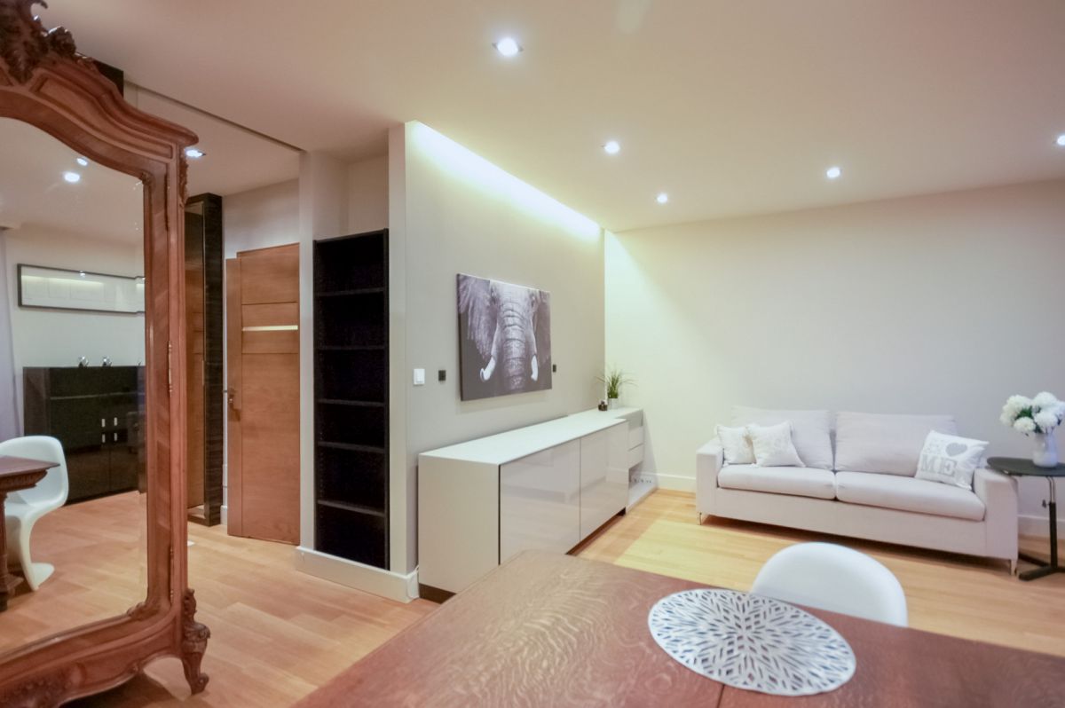 A high end studio with a balcony in the prestigious Marina Mokotów neighbourhood. Finished with attention to the smallest details with top quality materials - mainly wood and natural stone.